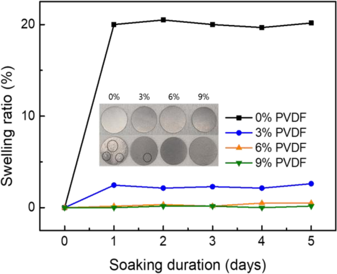 팽윤 시험. 분리판의 팽윤 정도는 제작된 분리판을 5 M 황산에 함침시킨 후 분리판의 두께를 1일 1회씩 총 5일 동안 측정하여 계산하였다. 분리판의 팽윤율은 식 (1)로 정의된다.