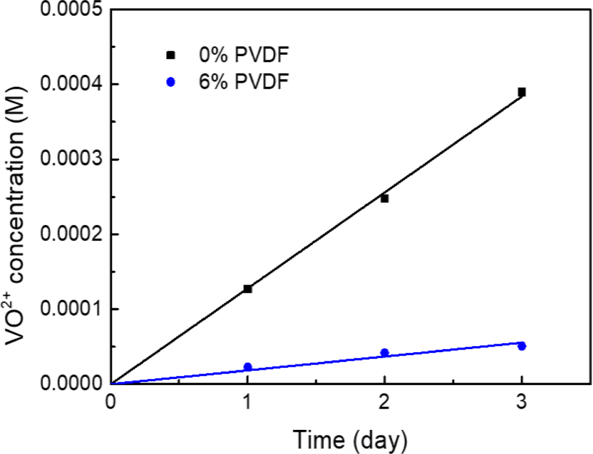 바나듐 투과도.분리판을 통한 바나듐 이온의 투과는 셀의 자가방전과 바나듐 이온의 불균형을 초래하기 때문에 낮은 바나듐 투과도는 분리판 제작 시 중요한 요소이다.10 분리판 투과도 실험을 위하여 실험방법에 제시한 바와 같이 바나듐 1.5 M의 VOSO4가 녹아 있는 3 M 황산 용액을 이용하여 분리판을 관통하는 바나듐 투과도를 측정하였으며 그 결과를 Figure 5에 나타내었다. 미세구조 관찰 결과 및 팽윤 실험 결과에서 예측된 바와 같이 6% PVDF가 혼합된 분리판의 경우 순수 팽창 흑연으로 제작된 분리판과 비교하였을 때 바나듐 투과도가 약 5배 감소됨을 확인하였다. 이러한 결과는 소수성 특성을 가지는 PVDF가 팽창 흑연 내에 골고루 분산되어 다공성 구조와 틈을 효과적으로 막아주면서 바나듐의 투과를 억제시킨 것으로 설명할 수 있다.