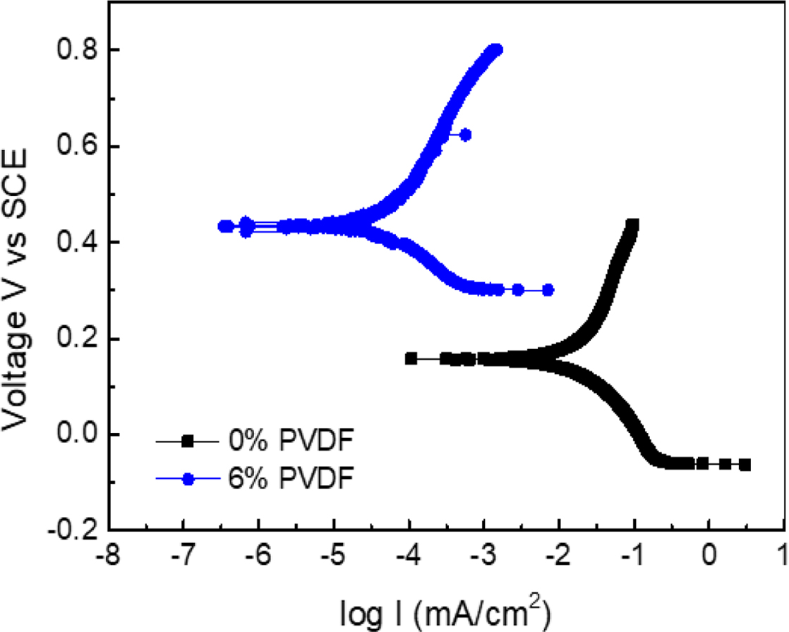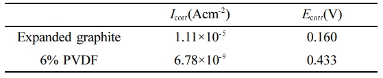 내식성 평가. 바나듐 흐름 전지는 산성 조건에서 운전되기 때문에 안정적인 셀 구동을 위해 높은 내식성을 가진 분리판이 요구된다. 부식이 일어나면 분리판 내에 많은 공극이 형성되고, 이는 분리판의 바나듐 이온의 투과를 증가시키고 기계적 강도를 감소시킨다.11,12 제작된 분리판의 내식성을 평가하기 위하여 2.5 M 황산에서 분극 실험을 시행하였으며 이 실험을 통해 얻은 분리판의 내식성 평가 결과를 Figure 6과 Table 1에 나타내었다. 상기 실험을 통해 부식 전류 밀도(Icorr)와 부식 전위(Ecorr)를 얻을 수 있었다. 일반적으로 부식 전류 밀도값이 클수록 빠르게 부식이 진행되는 경향을 보이고 부식 전위가 음의 방향으로 갈수록 부식에 대한 저항성이 낮은 것으로 보고되고 있다.13 이러한 기본적 배경 지식을 바탕으로 6% PVDF 분리판의 Icorr(6.78×10-9 Acm-2)과 Ecorr(0.433 V)을 팽창 흑연 분리판의 Icorr(1.11×10-5 Acm-2), Ecorr(0.160 V)과 비교하였을 때, 6% PVDF 분리판이 월등히 향상된 내식성을 보였다. 흑연 소재의 경우 edge plane의 촉매 효과로 인해 분해 전위가 낮아진다고 알려져 있다.14,15 이러한 선행 결과를 바탕으로 구조적으로 많은 크랙을 가지고 있는 순수한 팽창 흑연의 경우 촉매 효과를 나타내는 edge plane이 전해질에 노출되기 때문에 부식저항성이 낮아지는 반면 PVDF를 첨가한 분리판의 경우 상대적으로 적은 크랙으로 인해 전해질에 노출되는 edge plane이 감소하기 때문에 부식저항성이 향상된다고 설명할 수 있다. 또한 상대적으로 내산성이 있는 PVDF가 팽창 흑연에 첨가되어 분리판의 내식성이 향상되었다고 볼 수 있다.