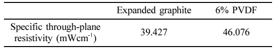 다. 본 연구에서 개발된 분리판의 관통 전기 저항을 확인하기 위해 실험방법에 제시된 측정법을 이용하여 관통 전기 저항을 측정하였으며 그 결과를 Table 2에 나타내었다. 결과에서 확인할 수 있듯이 PVDF가 6% 첨가되었을 때 분리판의 관통저항은 46.076 mWcm-1으로 순수한 팽창 흑연으로 제작한 분리판(39.427 mWcm-1)보다 약간 증가하였다. 이는 전도성이 없는 PVDF가의 팽창 흑연 내에 첨가되어 저항체로 작용하였기 때문이나 그 차이가 크지 않고, 기존에 보고된 100 mWcm-1 이상의 관통 전기 저항을 가진 복합 분리판보다 훨씬 낮은 수치를 보였다.16