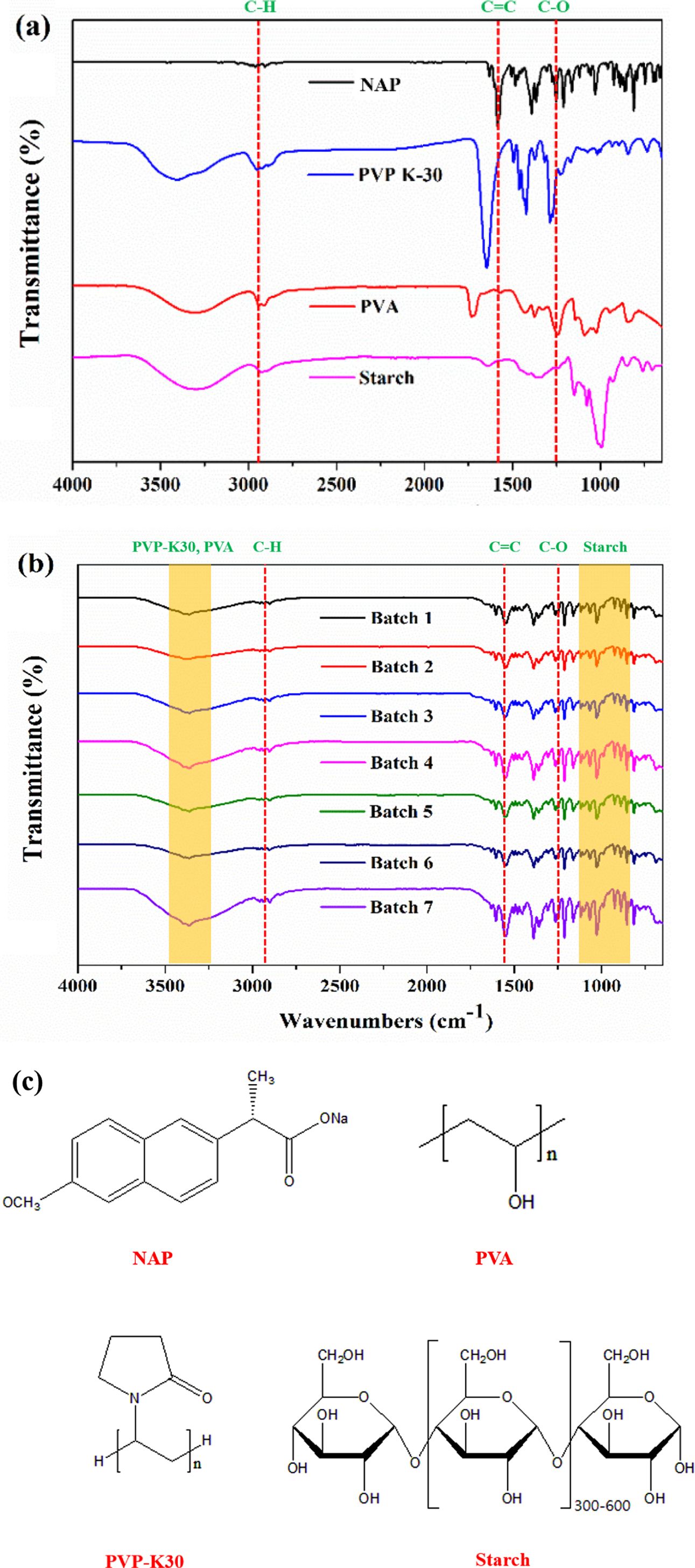 Figure 1 (a) FTIR spectra of NAP, PVP-K30, PVA, and starch; (b) Batch 1, Batch 2, Batch 3, Batch 4, Batch 5, Batch 6, and Batch 7; (c) chemical structures. |