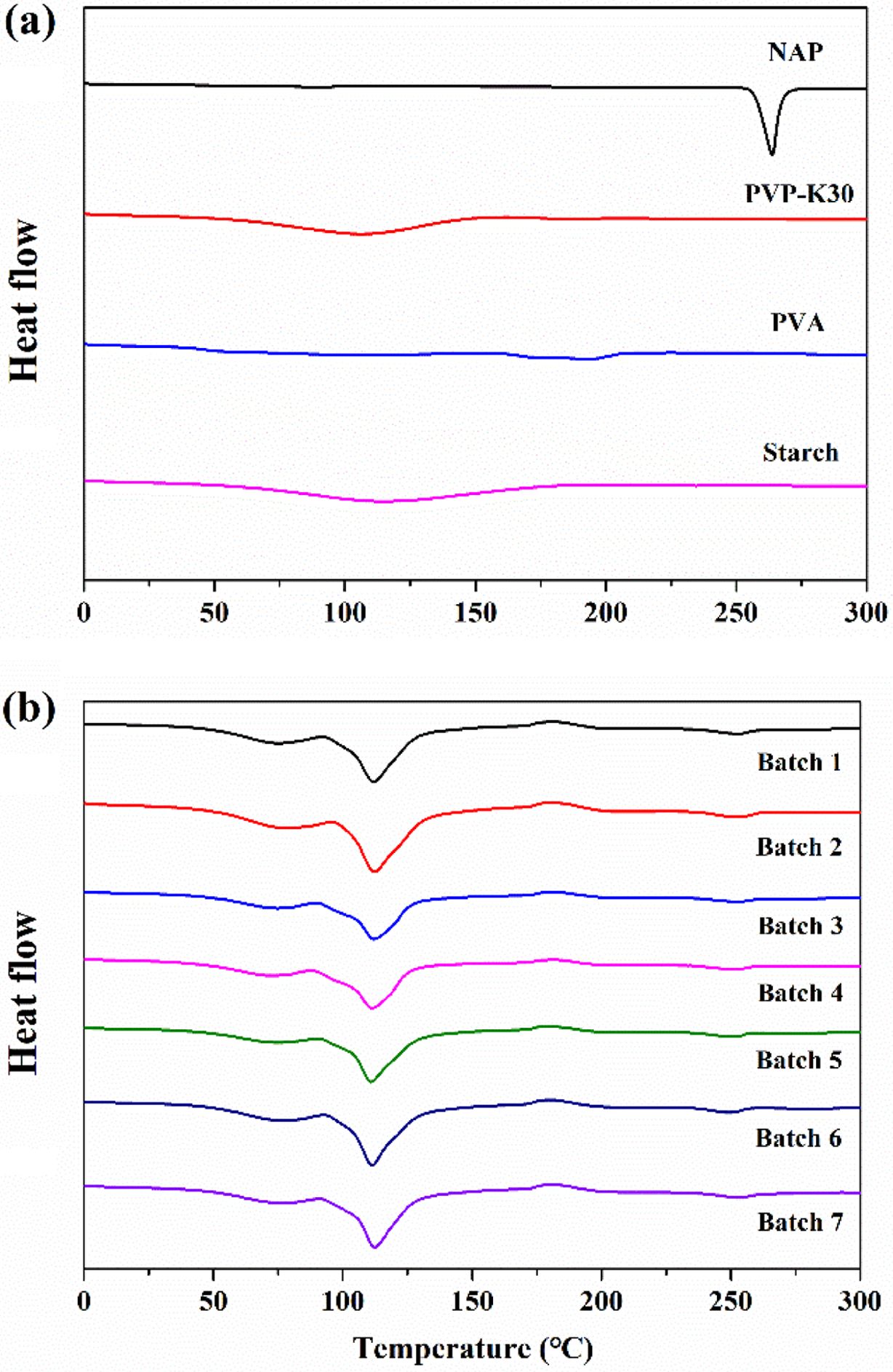 Figure 2 (a) DSC thermograms of NAP, PVP-K30, PVA, and starch; (b) Batch 1, Batch 2, Batch 3, Batch 4, Batch 5, Batch 6, and Batch 7 |
