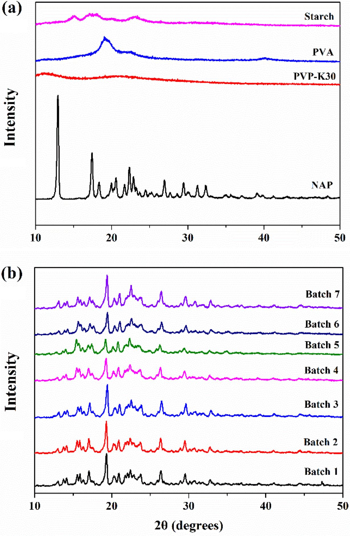 Figure 3 (a) XRD patterns of NAP, PVP-K30, PVA, and starch; (b)
