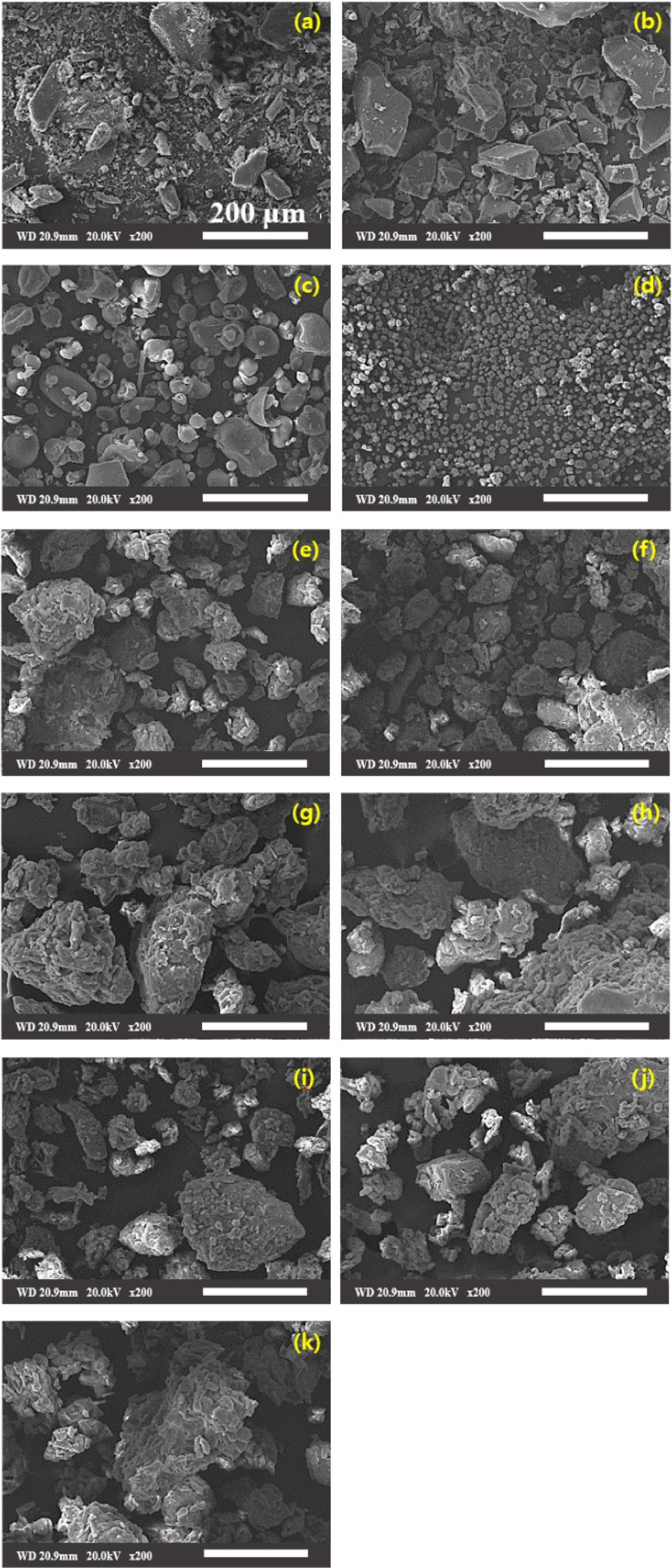 과립의 형태학적 분석.NAP, PVP-K30, PVA, 전분 및 제조된 과립물의 형태학적 분석을 위해 SEM 분석을18,19 실시하였으며, 그 결과는 Figure 4에 나타냈다. NAP는 100 μm 이하의 입자크기와 불규칙한 형태 및 분포를 확인할 수 있었으며, PVP-K30은 30 μm 이하의 입자크기를 가지고 있으며 상대적으로 균일한 구와 비슷한 형태를 확인할 수 있었다. PVA는 NAP와 비슷한 입자크기를 형성하고 있었으며, PVP-K30과 달리 경계가 확실하게 구분된 입자의 형태를 확인할 수 있었다. 전분은 10 μm이하의 균일한 입자크기를 가지며 균일한 직경을 가지는 크기 분포를 확인하였다. 제조된 과립물에서는 NAP와 PVP-K30, PVA, 전분이 가지고 있던 형태학적 특성이 나타나지 않았으며 전체적으로 입자들끼리 균일하게 응집되어 있는 모습을 확인할 수 있었고, 각각의 과립물에서 우수한 과립 형성을 확인하였다. 모델 약물의 용해도 개선을 위한 과립물 제조 시 사용된 수용성 고분자의 함량이 증가함에 따라 과립의 크기는 증가함을 확인하였지만 일정한 입자크기와 분포를 나타내는 것으로 보아 수용성 고분자의 함량은 과립물 형성에 영향을 미치지 않는다고 사료된다.