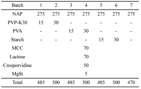 시약 및 재료.본 실험의 모델약물은 나프록센 나트륨(naproxen sodium, NAP) (HWAIL, 한국)을 사용하였으며, 용해도 개선을 위한 수용성 고분자로 폴리비닐알콜(polyvinyl alcohol, PVA)(Sigma-Aldrich, 미국), 폴리비닐피롤리돈(poly vinyl-pyrrolidone, PVP-K30)(SHOWA, 일본), 전분(starch) (SHOWA, 일본)을 사용하였다. 원활한 과립 제조를 위해 젖당(lactose monohydrate)(Junsei Chem Co. Ltd., 일본)과 미결정 셀룰로오스(microcrystalline cellulose, MCC)(JRS Pharma, 독일)를 부형제로 사용하였으며, crosporvidone (polyplasdone XL-10) (ISP Tech, 미국)을 붕해제로 사용하였고 스테아린산 마그네슘(magnesium stearate, MgSt)(Nitika Chemical, 일본)을 활택제로 첨가하여 과립을 제조하였다. 제조된 과립물 및 약물 방출 거동을 비교하기 위해 인스나프록센정®(Korea Ins pharm Inc., 한국)을 대조군으로 사용하였다. 실험에 사용된 모든 유기 용매는 HPLC 등급을 사용하였다.