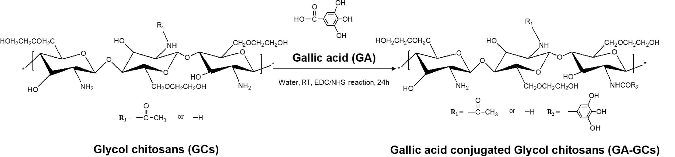 Synthesis scheme of gallic acid conjugated glycol chitosans (GA-GCs).