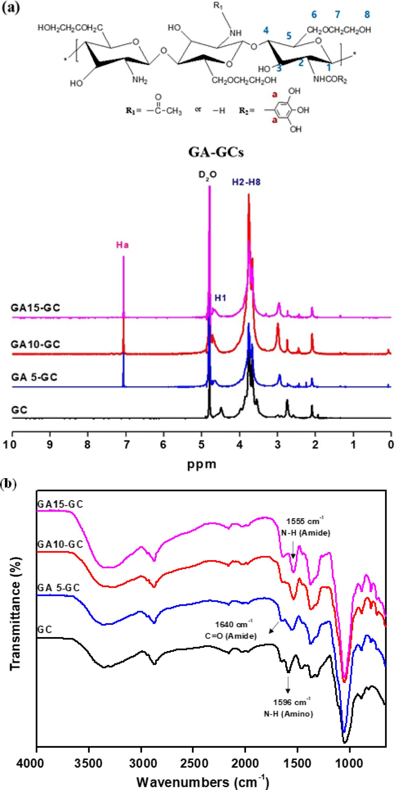 (a) 1 H NMR; (b) ATR-FTIR spectra of GC and GA-GCs.