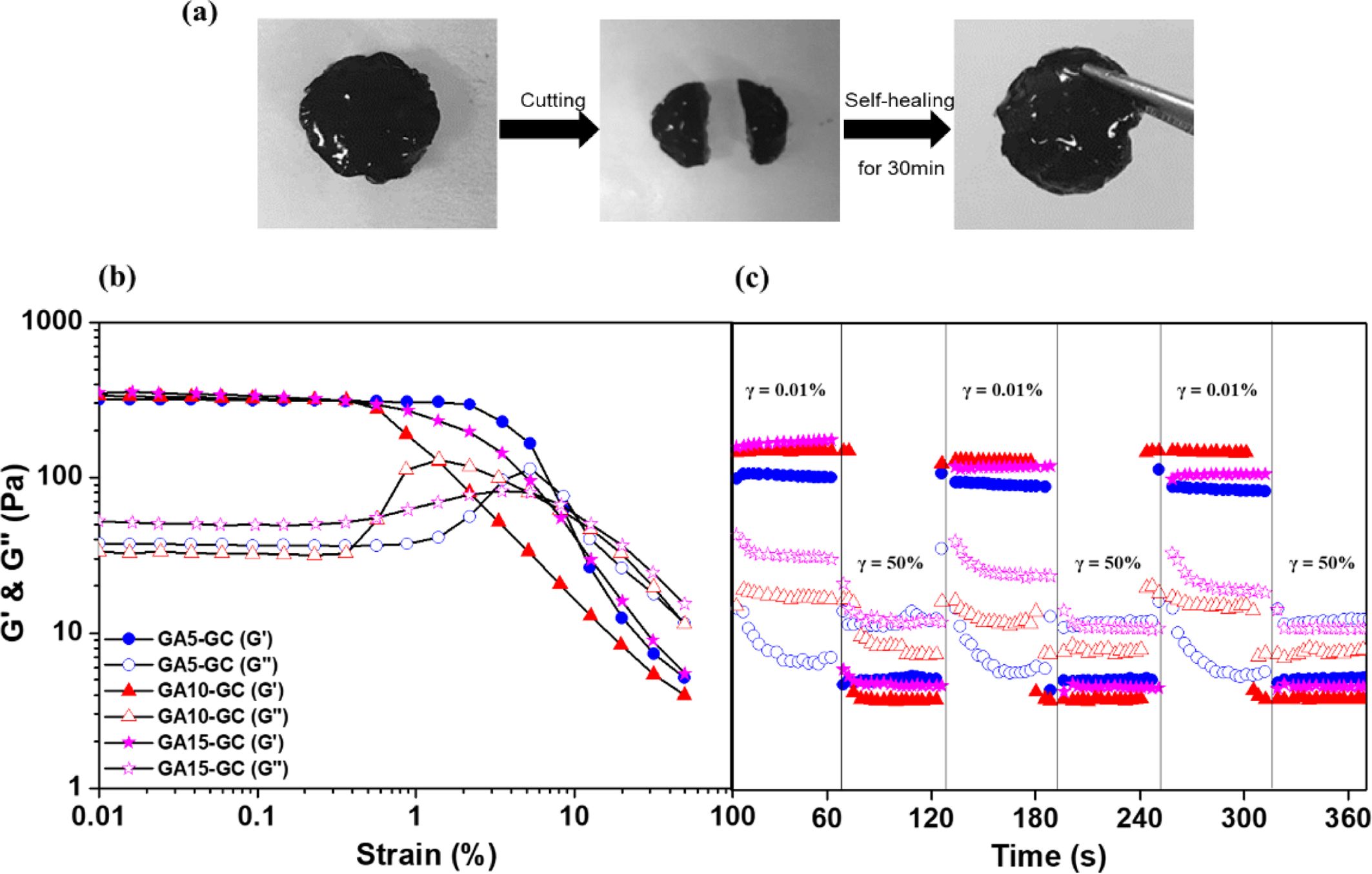 Self-healing ability of the GA-GC hydrogels. (a) Photographs showing the self-healing process of the GA-GC hydrogel; (b) The strain sweep test (γ=0.01%~50%) at 24 ℃ and a fixed frequency (1 Hz); (c) alternate step strain sweep test under a small strain (γ=0.01%) and a large strain (γ=50%) with 60 s intervals at 24 o C and a fixed frequency (1 Hz).
