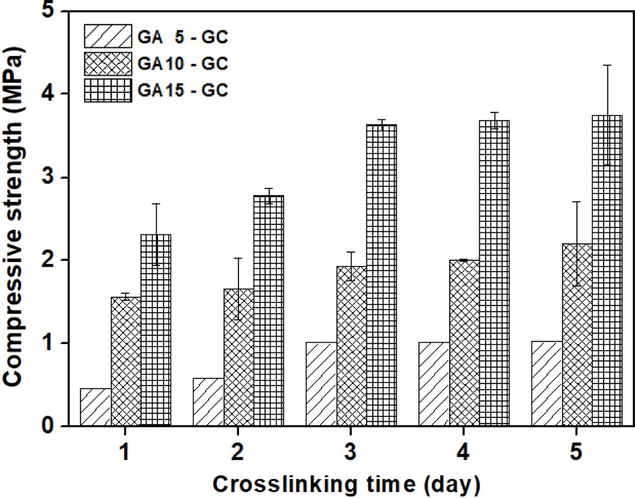 Compressive strength of GA-GC hydrogels. Each data point presents mean ± standard deviation (n=3).