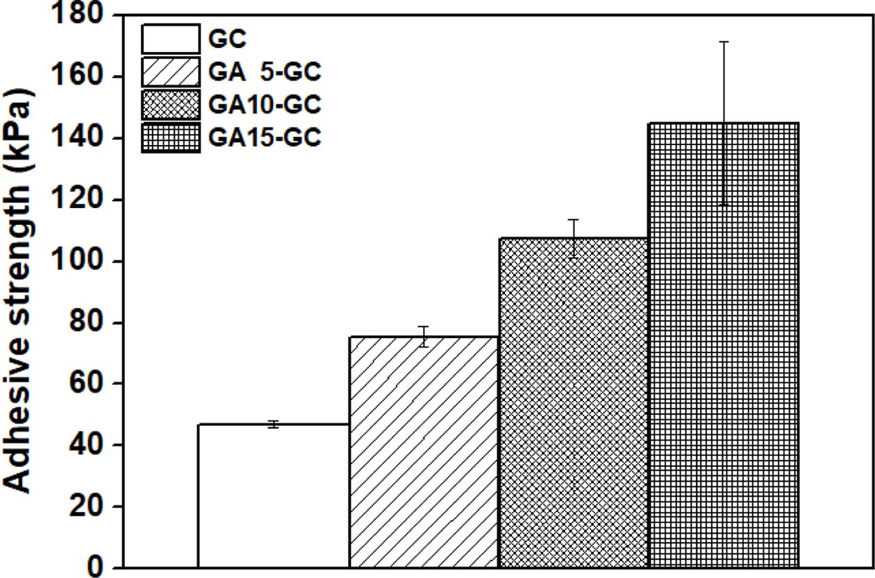 The lap-shear adhesion strength of GC and GA-GCs hydrogels. Each data point presents mean ± standard deviation (n=3).