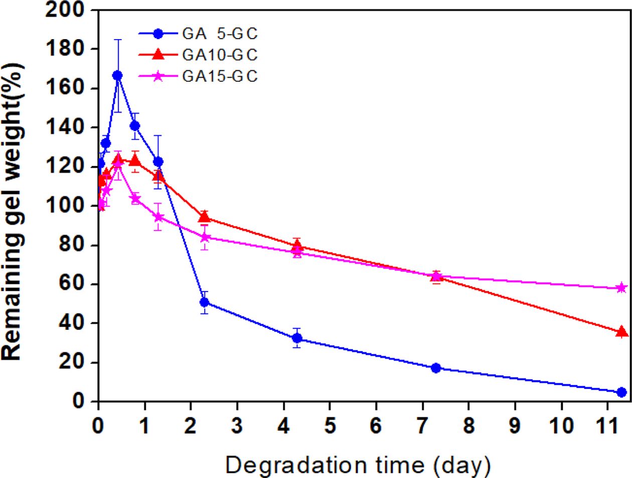 Enzymatic degradation profiles of GA-GCs hydrogels in PBS containing 10 mg/mL lysozyme at 37 ℃. Each data point presents mean ± standard deviation (n=3).