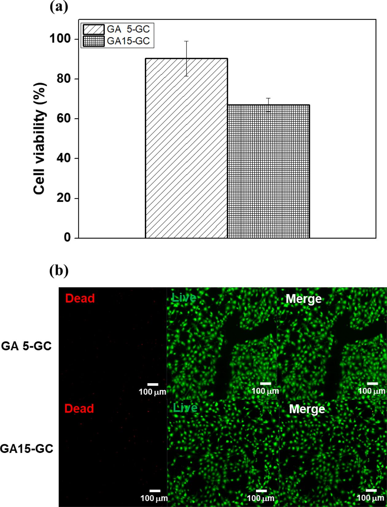 (a) In vitro cytotoxicity study of GA5-GC and GA15-GC to observe cell viability in NIH 3T3 cells. Data are presented as the mean ± standard deviation (n=3); (b) live/dead assay of NIH 3T3 cells cultured in cell culture medium containing 1.0 wt% GA-GCs hydrogels for 2 days.