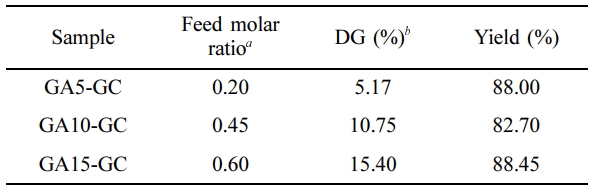 GA-GC의 합성 및 분석.GC 0.1 g을 3차 증류수 50 mL에 녹인다. 3차 증류수 20 mL에 GA를 Table 1에서 제시된 반응비에 해당하는 양을 첨가하여 녹인 후 같은 당량의 EDC/NHS를 넣어준 후 질소 상태로 1시간 교반하였다. 충분히 녹인 GC 용액을 첨가하여 질소 상태로 24시간 동안 교반 하에 반응시켰다. 반응 용액을 투석막(molecular weight cut-off: 12-14 kDa)을 이용하여 2일간 투석한 후 동결건조하여 파우더 형태의 GA-GC를 얻었다.23-25 합성된 고분자 샘플을 D2O 용매에 0.5 wt%로 용해시킨 후 Bruker사의 600 MHz NMR (AVANCE III 600 spectrometer, 독일)을 사용하여 얻은 1H NMR 스펙트럼에 의해 화학적 조성 분석을 수행하였다. Thermo Scientific 사의 ATR-FTIR(Nicolet iS 5, 미국) 기기를 이용하여 4000-750 cm-1 파수 범위에서 4 cm-1의 분해능, 32회 스캔을 통해 얻어진 고분자 샘플의 FTIR 스펙트럼을 분석하였다.