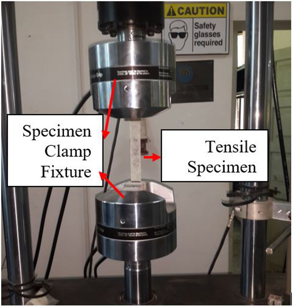 Tensile Testing. The tensile testing specimens were obtained from manufactured laminate sheets. The final dimensions of samples after cutting are reported in Table 4. At least three samples were tested for each stacking sequence under consideration on the MTS800 universal testing machine. The tensile test was performed at a 2 mm/min strain rate, room temperature, and at 60% relative humidity. [G]5 laminate during testing is shown in Figure 3.