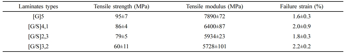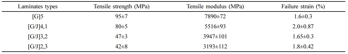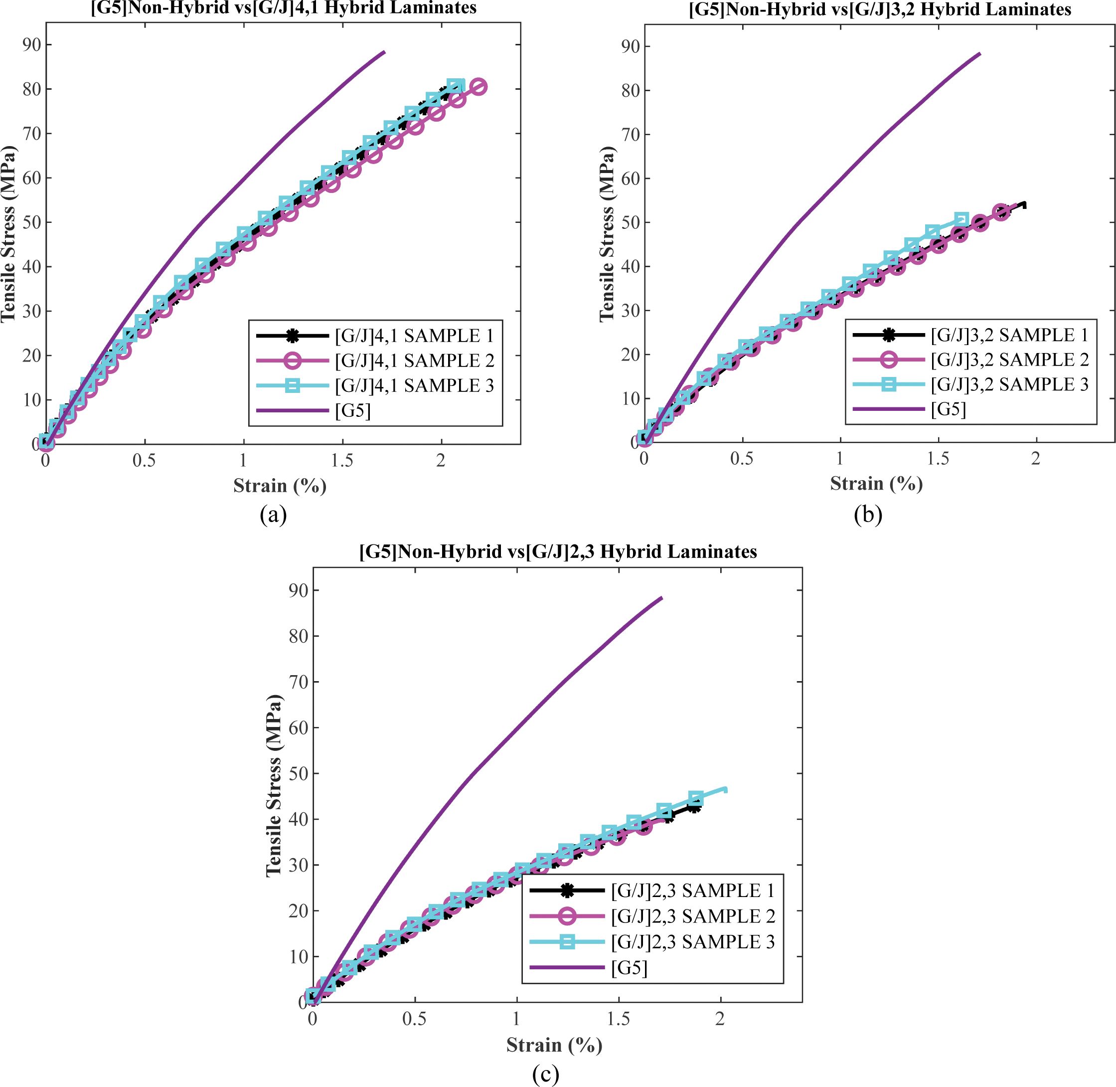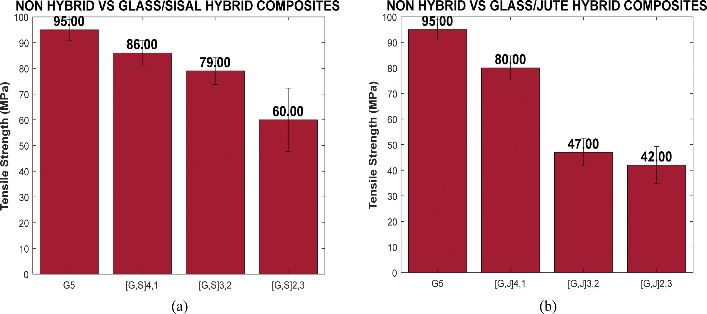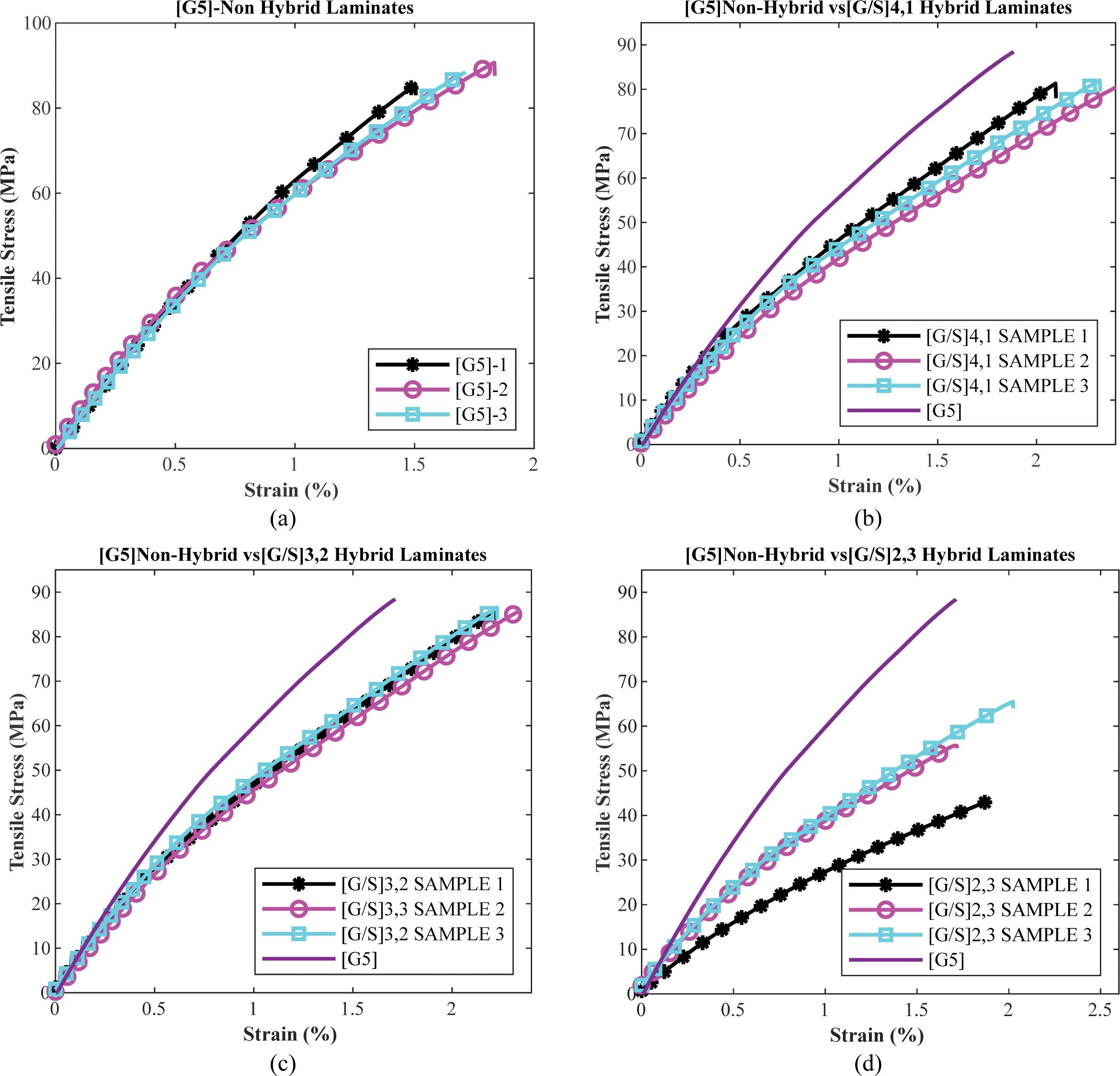 Experimental Tensile Testing. Stress vs. strain trends for all the composite laminates are reported in Figure 4 and Figure 5. Figure 4(a) presents the tensile testing results of glass fiber reinforced laminates. Figure 4(b-d) compares averaged results from non-hybrid laminates with glass/sisal hybrid composite laminates. Similarly, Figure 5 compares averaged results from non-hybrid laminates with glass/jute hybrid composite laminates. A significant change in tensile strength was observed due to the presence of natural fiber reinforcements. The maximum tensile strength for glass fiber-reinforced laminate [G]5 is 95 MPa as it contained glass fibers only, while for glass/sisal hybrid laminate, the maximum strength of 86 MPa was observed for [G/S]4,1. The [G/S]4,1 laminate with sisal at the mid-plane and surrounded with glass fibers showed highest tensile strength than the other glass/sisal laminates. A single sisal fiber layer produces adequate bonding with other glass fiber layers, thus showing sisal fiber ability to substitute glass fiber without significant tensile strength loss. The lowest tensile strength in glass/sisal hybrid composites was observed for [G/S]2,3 laminate. The lowest strength of these laminates is due to the higher content of sisal fibers in the laminate and the poor adhesion between the consecutive sisal fiber layers. Table 5 and Table 6 report the experimentally evaluated engineering constants for hybrid composites.
