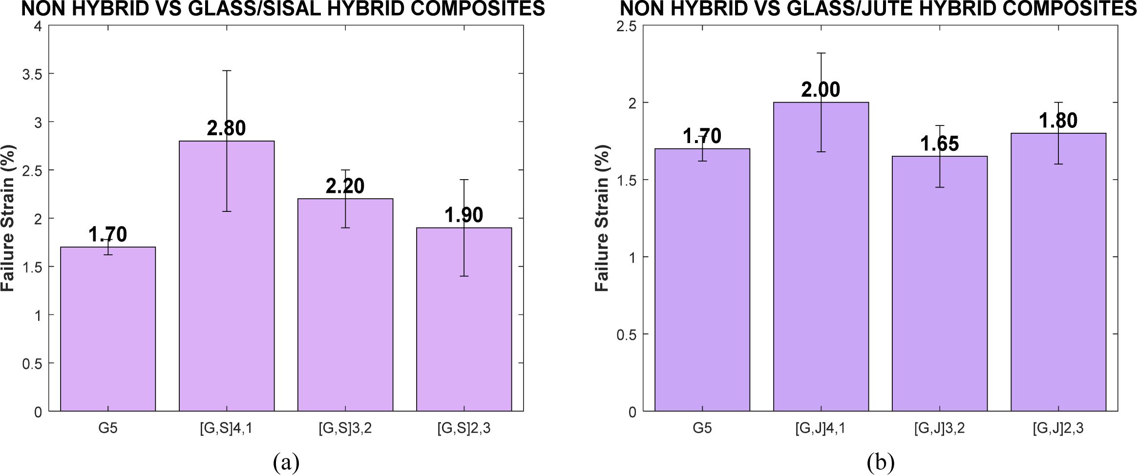 The tensile strength of glass/jute hybrid composite was lower in comparison with sisal/glass hybrid composites. The highest tensile strength was observed for [G,J]4,1 laminate, i.e., 80 MPa. The tensile strength for [G,J]3,2 was 47 MPa, which presents a drastic decline in properties due to sisal fibers’ addition. Interestingly the tensile strength of [G,J]2,3 is comparable to [G,J]3,2. Previous researchers reported similar results; for example, Sezgin et al.28 studied the effect of the stacking sequence of different fibers in hybrid composites. Yahya et al.29 performed a similar study for hybrid composites arranged with different natural fibers. It was observed that the mechanical properties of the hybrid composites lie between individual fiber-reinforced composites. Maximum failure strain of 2.2% was found in [G,S]2,4 hybrid composites. The bar charts for maximum tensile strength and failure strains are presented in Figure 6 and Figure 7.