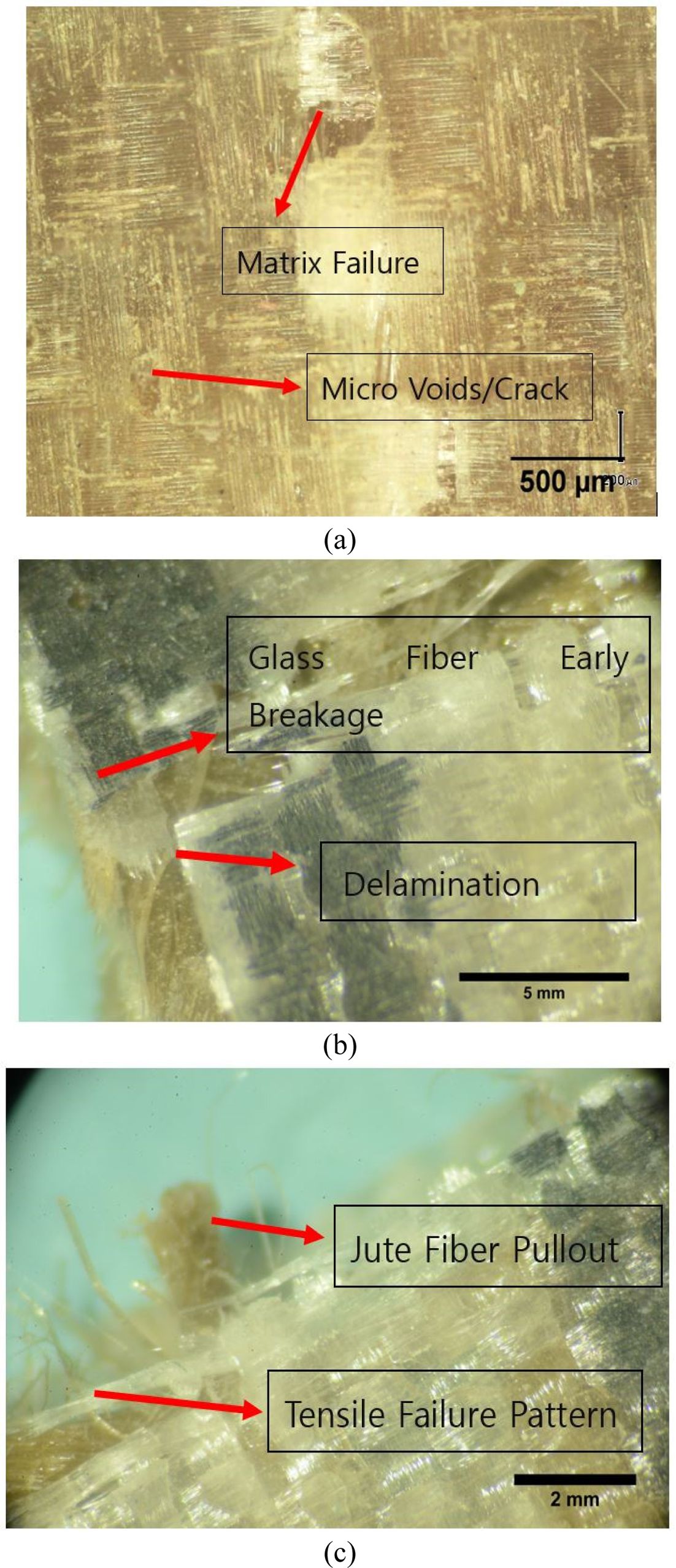 composite failure pattern; (c) jute fiber pull out in glass/jute hybrid