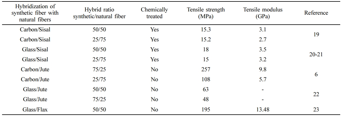 Besides their use as individual reinforcements to polymers, more than one natural fiber is also used to obtain synergic advantages of multiple fibers. Hybridization is a widely utilized method to acquire the optimum properties harnessing the benefits of multiple materials.10-12 Hybridization promotes collaboration between the mechanical properties and costs to meet indicated design requirements, as natural fibers are cheaper than synthetic fibers. Several studies on hybridization phenomena have been reported by many researchers.13,14 Therefore, optimum mechanical properties can be achieved through the hybridization of synthetic fiber with natural fibers. Various studies have been reported on natural fiber utilization to produce NFRPCs, for example, bamboo,15 coir,16 sisal,17 and banana.18 A summary of previous work on the hybridization of NFRPCs is reported in Table 1.19-23