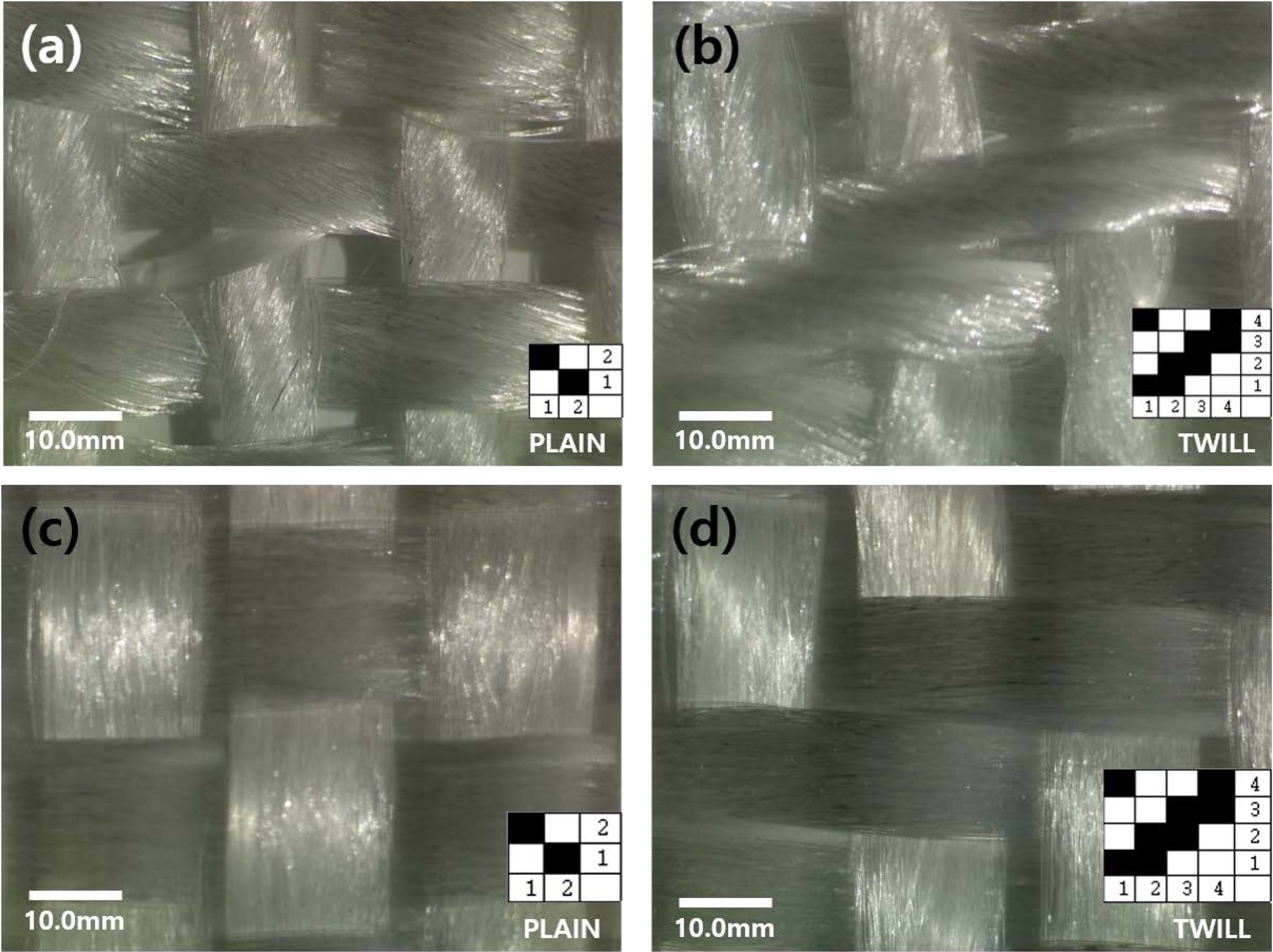 Figure 2 Optical microscopy images of prepared woven fabric using commingled yarn produced using the (a,b) covering method; (c,d) ATY method with two different weaving patterns, plain and twill. |