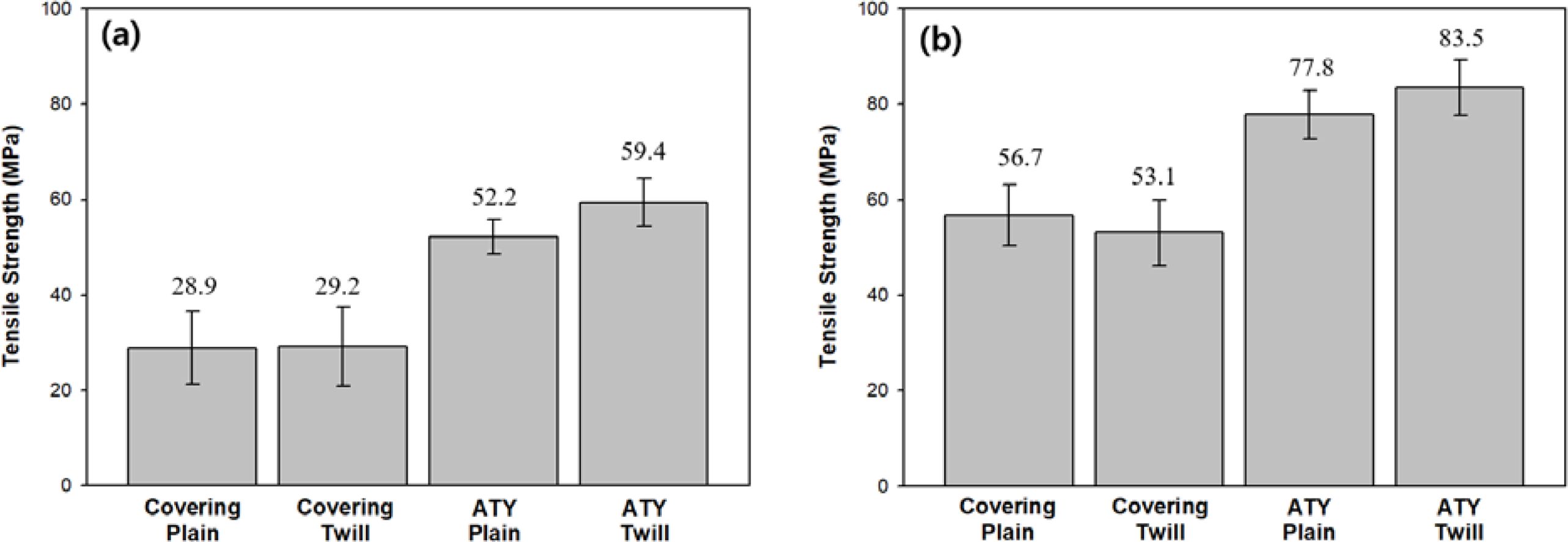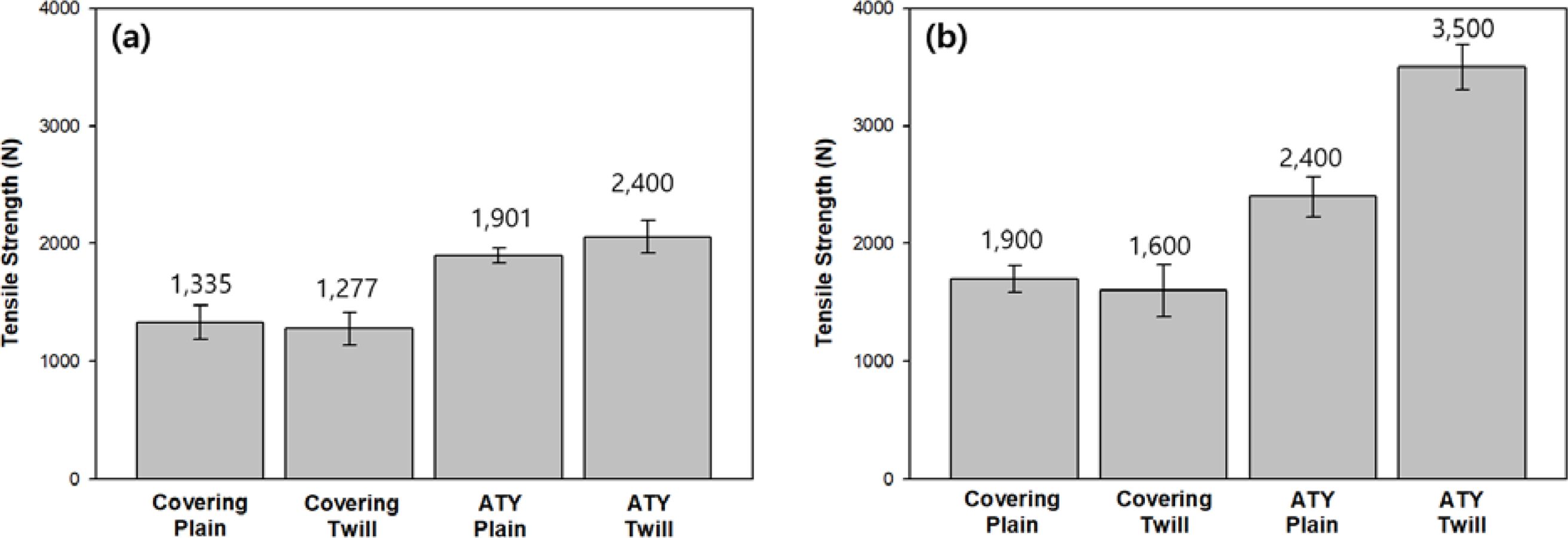 Figure 3 Tensile strength of woven fabrics in the (a) weft direction; (b) warp direction. |