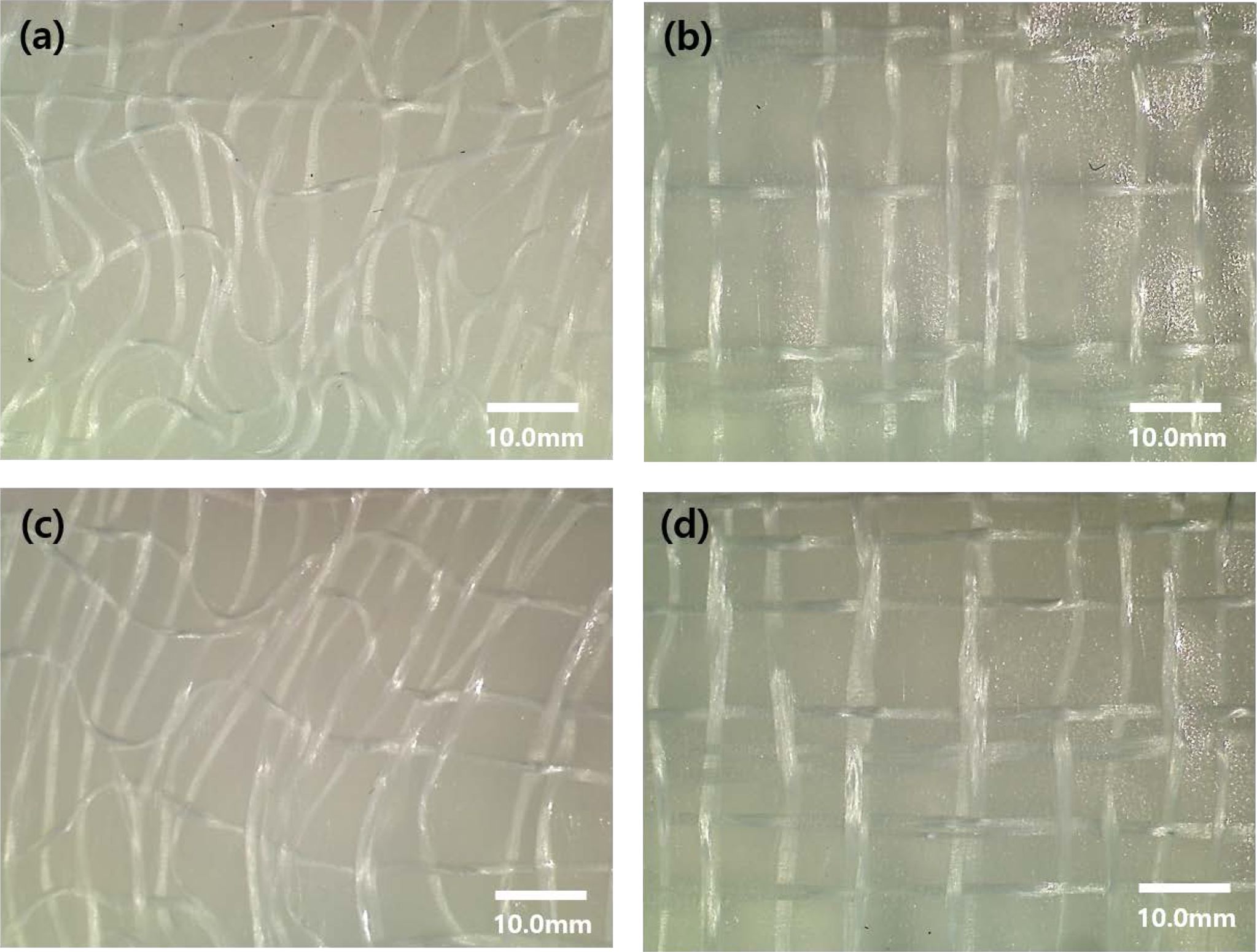 Figure 4 Images of the final GF/PP composite prepregs prepared using (a) plain pattern covering commingled yarn; (b) plain pattern ATY commingled yarn; (c) twill pattern covering commingled yarn; (d) twill pattern ATY commingled yarn. |