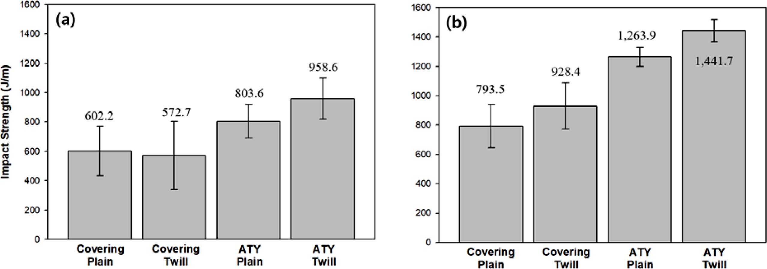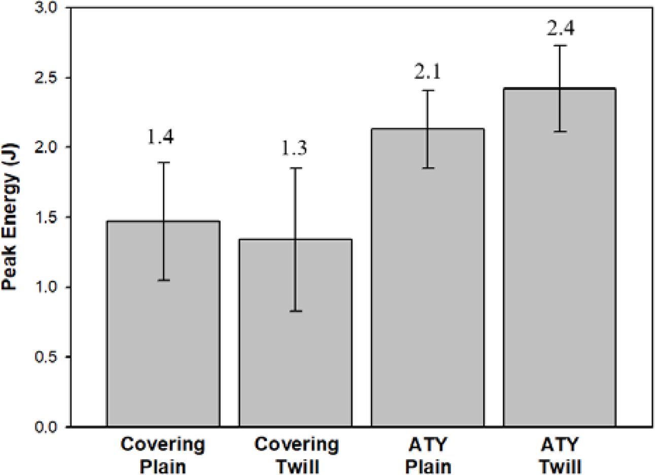 9350 Drop Tower machine. The specimen was punctured at its center using striker, perpendicular to the specimen. As shown in Figure 7, the peak energy at puncture test was around 1.4, 1.3, 2.1, and 2.4 J for the covering plain, covering twill, ATY plain, and ATY twill GF/PP composite prepregs, respectively. The higher puncture resistance of the ATY commingled yarn GF/PP composite prepregs could be attributed to the well-organized GF pattern and PP impregnation which would cause an increase in stability during the