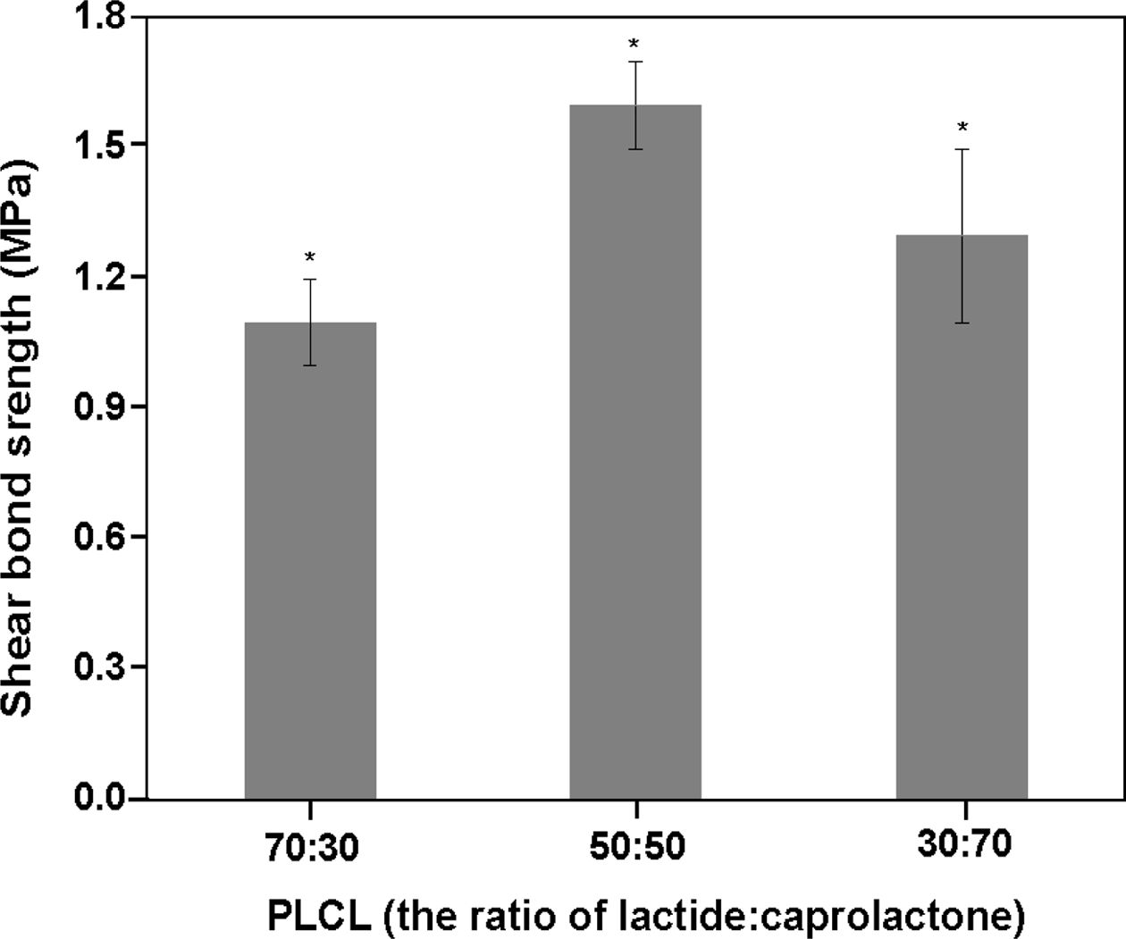 Figure 1 Shear bond strength of poly(L-lactide-co-ε-caprolactone) (PLCL) according to molar ratio (n=5, *P<0.05). |