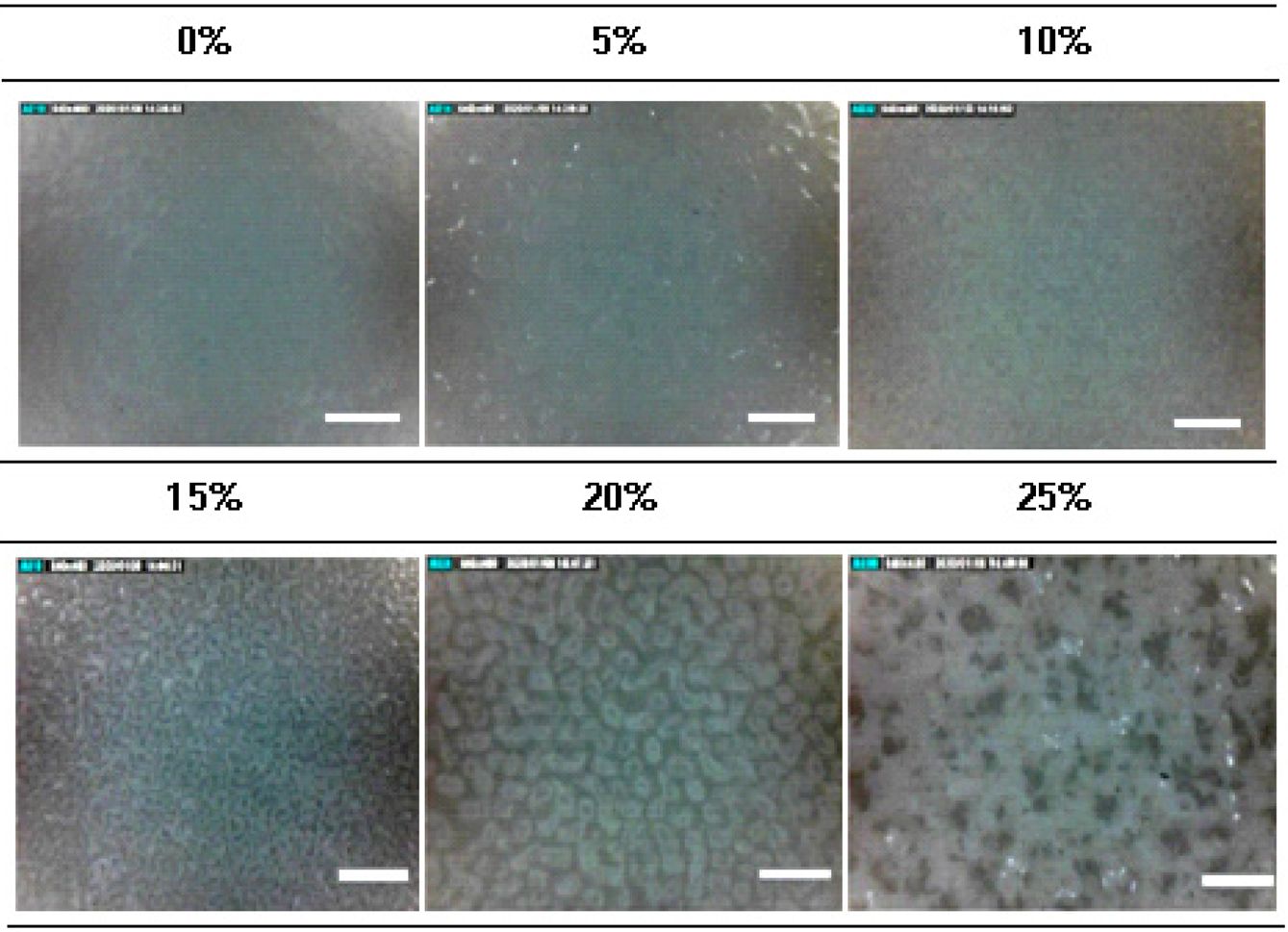 Figure 2 Surface morphological study and dispersion state of TiO2 using a digital microscope (TiO2 = 0, 5, 10, 15, 20, 25%, ×250, scale bar: 400 µm). |