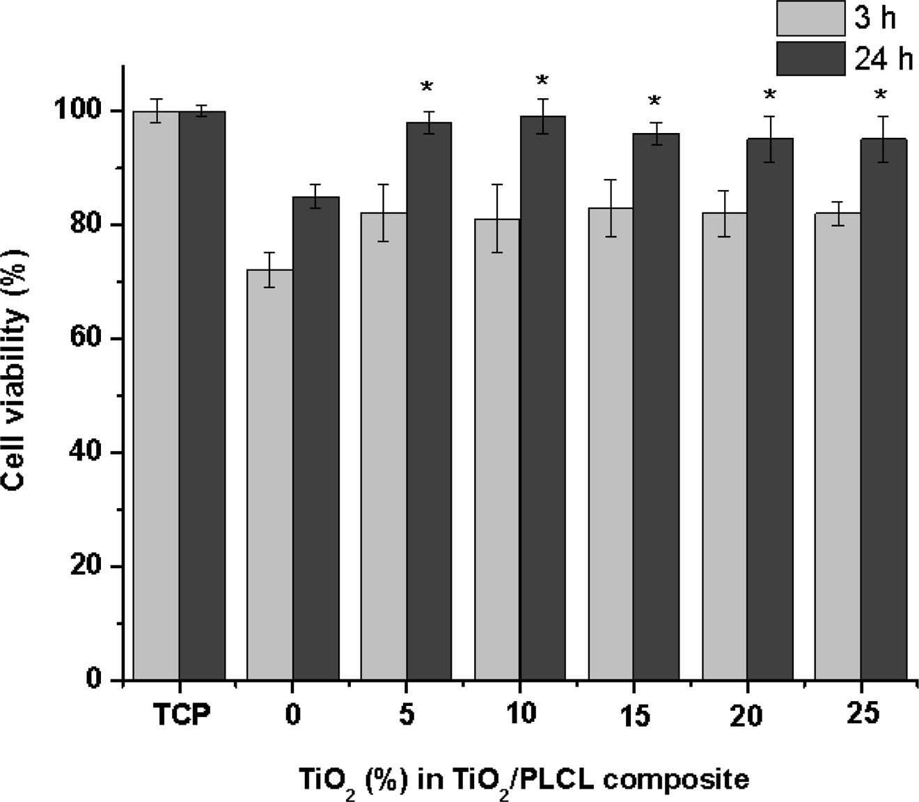 Figure 3 Cell viability of TiO2/PLCL (50:50) according to TiO2 concentration (n=5, *P>0.05). |
