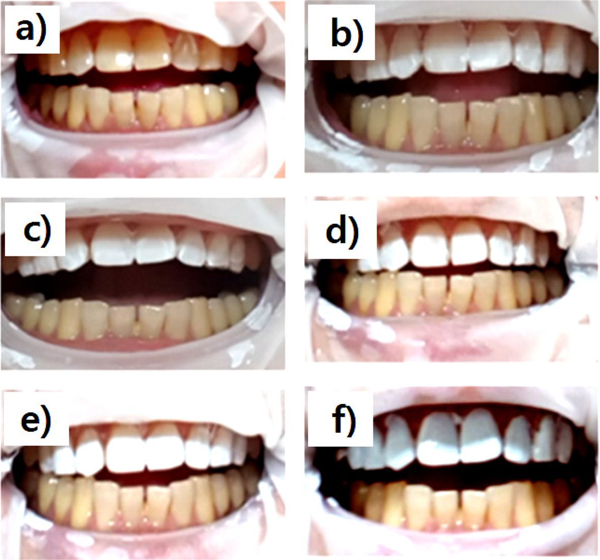 Figure 4 Photographs of the TiO2/PLCL (50:50) composite at various TiO2 concentrations applied to the teeth. (a) 0%; (b) 5%; (c) 10%; (d) 15%; (e) 20%; (f) 25% |