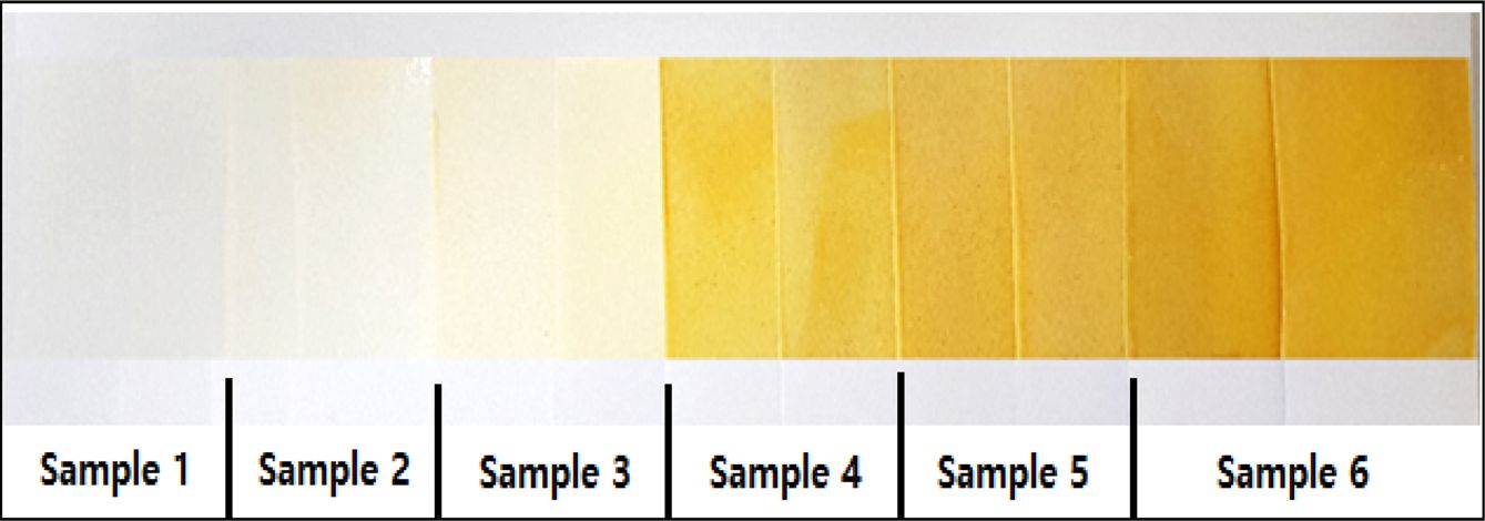 Figure 5 Various colors producing using gardenia yellow (sample number in Table 3). |