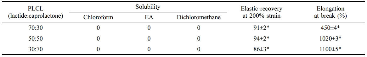 Table 1 Properties of Poly(L-lactide-co-ε-caprolactone) (PLCL) according to Molar Ratio (n=5, *P<0.05) |