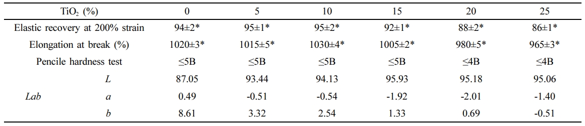 Mechanical Properties of the TiO2/PLCL Composites. The mechanical properties of the TiO2/PLCL (50:50) composites with TiO2 concentrations of 0, 5, 10, 15, 20, and 25% are shown in Table 2. Superior elastic recovery and elongation properties were observed in the TiO2/PLCL composite at 10% and 15%; however, these were lower in the rest of the samples. In addition, a low hardness of 4 B was observed from the surface hardness test of the TiO2/PLCL composites at 20% and 25%. Meanwhile, composites with a TiO2 concentration of less than 20% had a relatively high hardness of 5 B. The hardness of 5 B is sufficient for removing the coated tooth manicure by brushing teeth. Therefore, we suppose that the lower mechanical properties at 20% and 25% were because of the weakened interconnectivity and higher surface roughness due to excess TiO2 particles in the composite. Enhanced whitening effect and good mechanical properties were observed with increasing TiO2 concentration at a TiO2 concentration of less than 20%. However, there was no clearly observed difference in the whitening effect in the composite at 10% and 15%. Therefore, a TiO2 concentration of 10% was considered optimal because it resulted in good mechanical properties and an enhanced whitening effect.