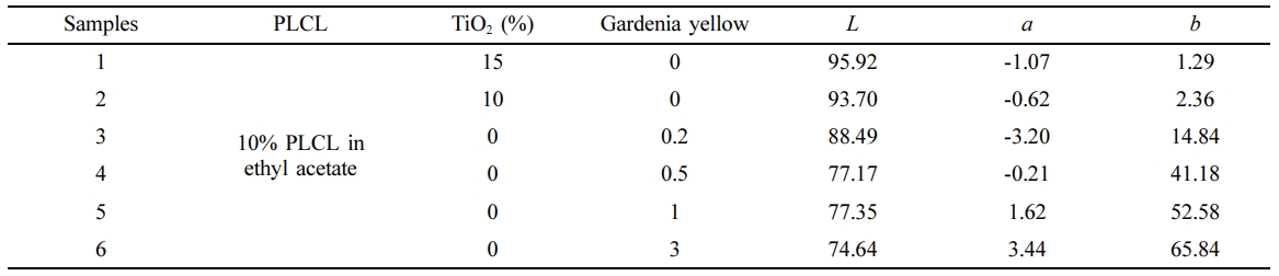 To produce various yellow colors, gardenia yellow and TiO2 were mixed in PLCL, as shown in Table 3. The film was prepared as described earlier, and the color analysis was carried out.