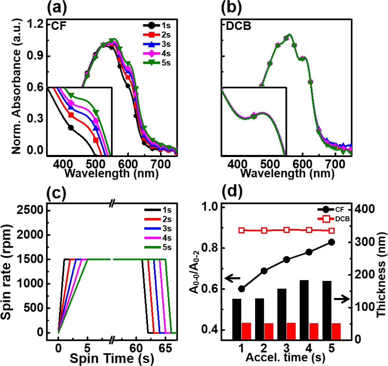 클로로포름으로 제조된 P3HT 박막의 경우 가속 시간이 1초에서 5초로 증가함에 따라 P3HT 분자의 interchain의 결정 성장을 나타내는 (0-0), (0-1) transition 피크가 증가하였다. 스핀코팅 시 가속도가 느려지면 최종 회전 속도에 도달하는 시간이 증가하게 되어 초기 용매 증발속도가 느려지고 그로 인해서 고분자들의 규칙도가 증가하였다. 디클로로벤젠으로 제조된 P3HT 박막의 경우 가속 시간이 증가하여도 고분자들의 규칙도가 변하지 않았다. 높은 비점을 갖는 용매를 사용할 경우 초기 용매의 증발속도가 느리기 때문에 가속 시간의 영향을 받지 않는다.