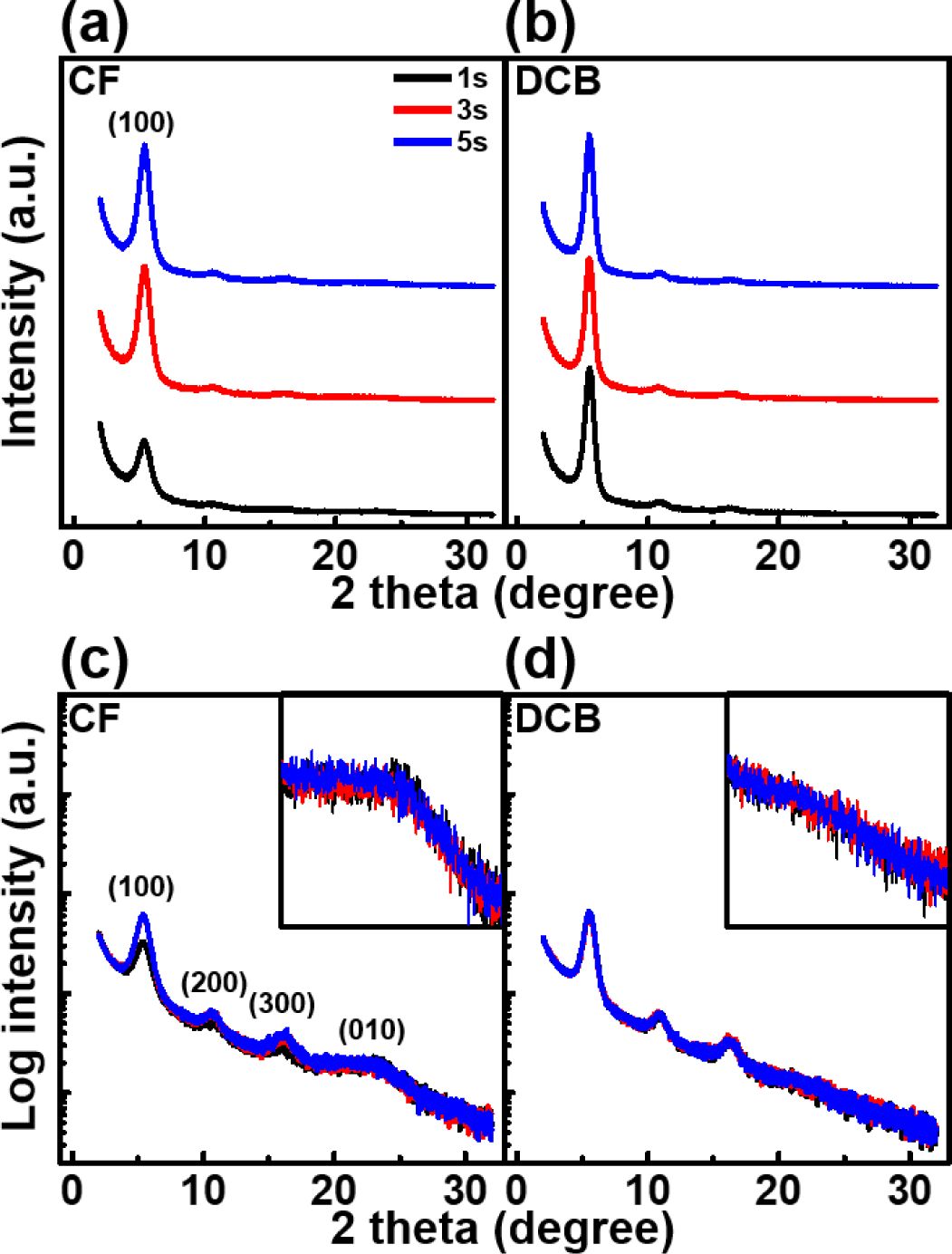 Figure 2는 용매 별 가속 시간에 따른 P3HT 박막의 결정화도를 GIXD를 사용하여 측정하였다. 클로로포름을 사용한 P3HT 박막은 가속 시간이 증가할수록 (100) 피크가 크게 증가하는 것을 확인할 수 있었다. 저비점 용매는 가속 시간이 증가하게 되면 초기 스핀코팅 과정 중에 증발속도가 느려지게 되며 고분자의 규칙도가 증가하여 (100) 피크가 증가하게 된다. 반면, 디클로로벤젠을 사용할 경우 가속 시간의 변화에 상관없이 모든 P3HT 박막에서 높은 (100) 피크를 관찰할 수 있었다. 고비점 용매는 가속 시간에 상관없이 용매의 증발속도가 느리기 때문에 고결정성의 P3HT 박막을 형성하였다.21