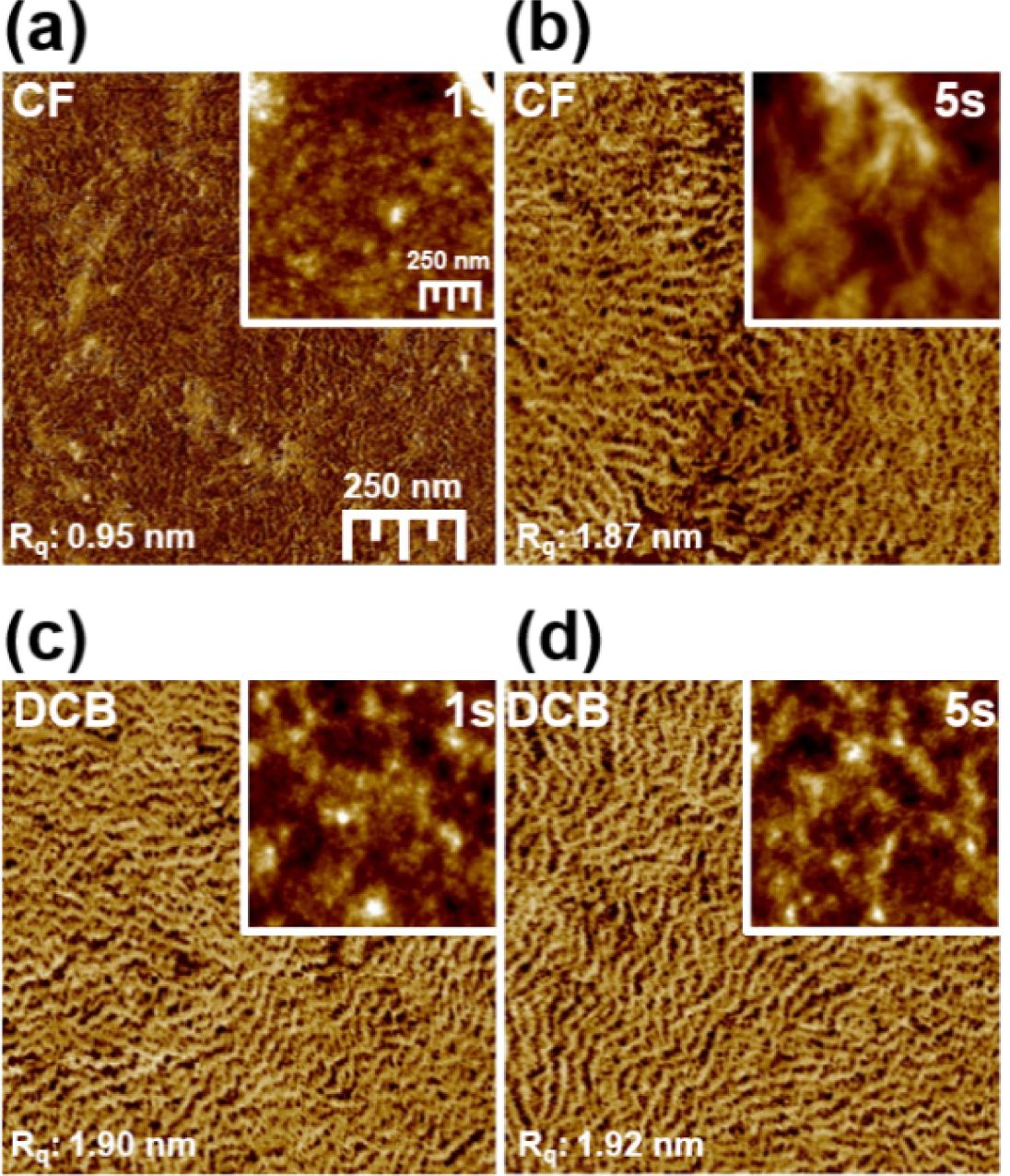 Figure 3은 용매에 따른 가속 시간의 변화가 P3HT 박막의 모폴로지에 미치는 영향에 대해 조사하기 위해 AFM을 이용하여 분석하였다. 클로로포름을 사용한 P3HT 박막의 경우 1초의 가속 시간에서는 나노와이어가 관찰되지 않았지만(Figure 3(a)), 가속 시간이 증가함에 따라 나노와이어가 성장된 것을 확인할 수 있었다(Figure 3(b)). 느려진 용매의 증발속도는 P3HT 자기조립을 촉진시켰다. 디클로로벤젠을 사용한 P3HT 박막에서는 가속 시간에 상관없이 모두 나노와이어가 성장된 것을 관찰하였다. 고비점 용매는 스핀코팅 동안 증발속도가 느리기 때문에 고분자가 자기조립되는 시간이 길어서 나노와이어의 성장이 가속 시간에 영향을 받지 않는다.