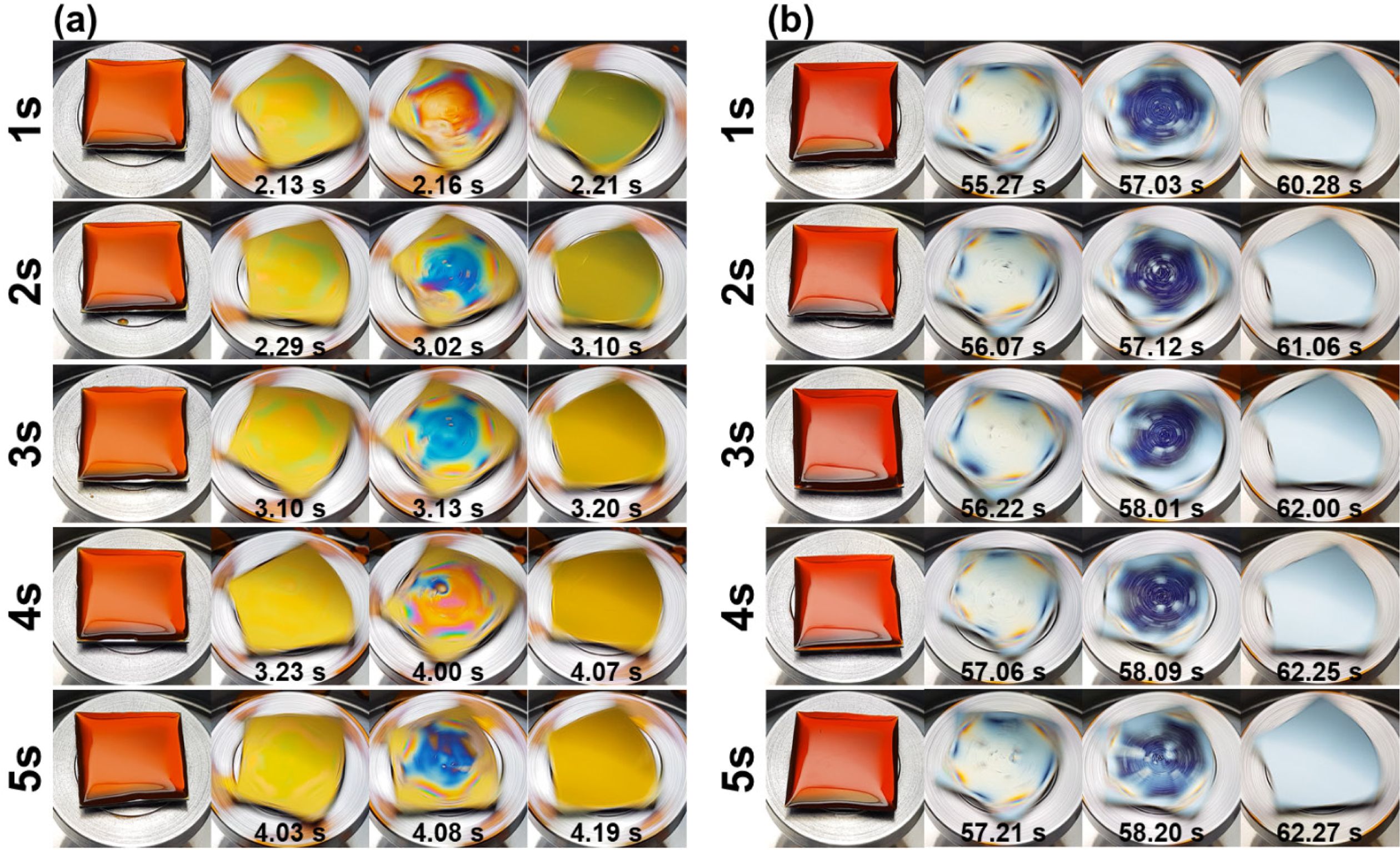 Figure 4 Video microscopy image of the spin coating process by the different acceleration times using (a) chloroform; (b) dichlorobenzene. |