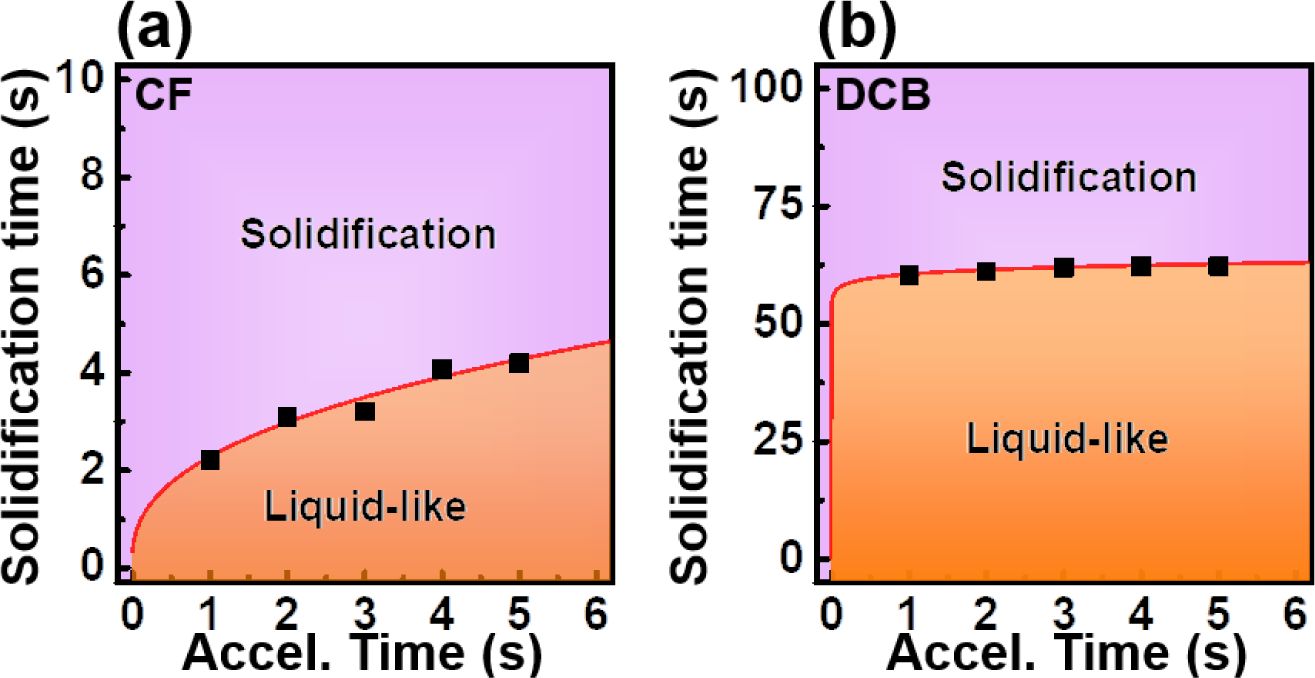 Figure 5는 가속 시간에 따른 박막의 고체화 시간을 정리한 그래프이다. 클로로포름을 사용하여 P3HT 박막을 제조할 경우, 가속 시간이 증가함에 따라 고체화 시간이 비례하여 증가하는 것을 알 수 있다. 즉 클로로포름의 증발속도는 스핀코팅 초반의 가속 시간에 영향을 받으며, 가속 시간을 증가시키면 P3HT 용액의 고체화 시간을 지연시킬 수 있음을 의미한다. 반면, 디클로로벤젠을 사용할 경우에는 가속 시간의 증가에도 고체화 시간은 일정하게 매우 느린 건조 시간을 가진다는 것을 알 수 있다. 이를 통하여 낮은 비점을 갖는 용매를 사용하여 P3HT 박막을 제조할 경우 스핀코팅 초반의 가속 시간을 P3HT 분자의 자기조립 거동을 결정하는 데 큰 영향을 미친다는 것을 알 수 있다.