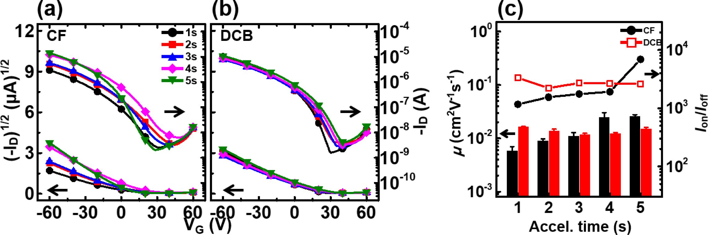 전달 곡선으로부터 식 (1)을 이용하여 다양한 가속도 시간에 따른 전계효과 이동도를 계산하여, 용매에 따른 전계효과 이동도 변화의 경향을 Figure 6(c)에 정리하였다. 클로로포름으로 제조된 박막의 경우 가속 시간이 5초인 경우에 전계효과 이동도가 2.58×10-2 cm2/Vs로 측정되었으며, 가속 시간이 1초일때 이동도 5.87×10-3 cm2/Vs보다 약 4.4배 증가하였다. 디클로로벤젠으로 제조된 박막의 경우에는 가속 시간 1초에서 1.63×10-2 cm2/Vs, 5초에서 1.51×10-2 cm2/Vs로 가속 시간에 영향을 받지 않았다. 가속 시간의 조절을 통해 낮은 비점의 클로로포름 용액을 이용하여 손쉽게 높은 전하이동도를 얻을 수 있었다.