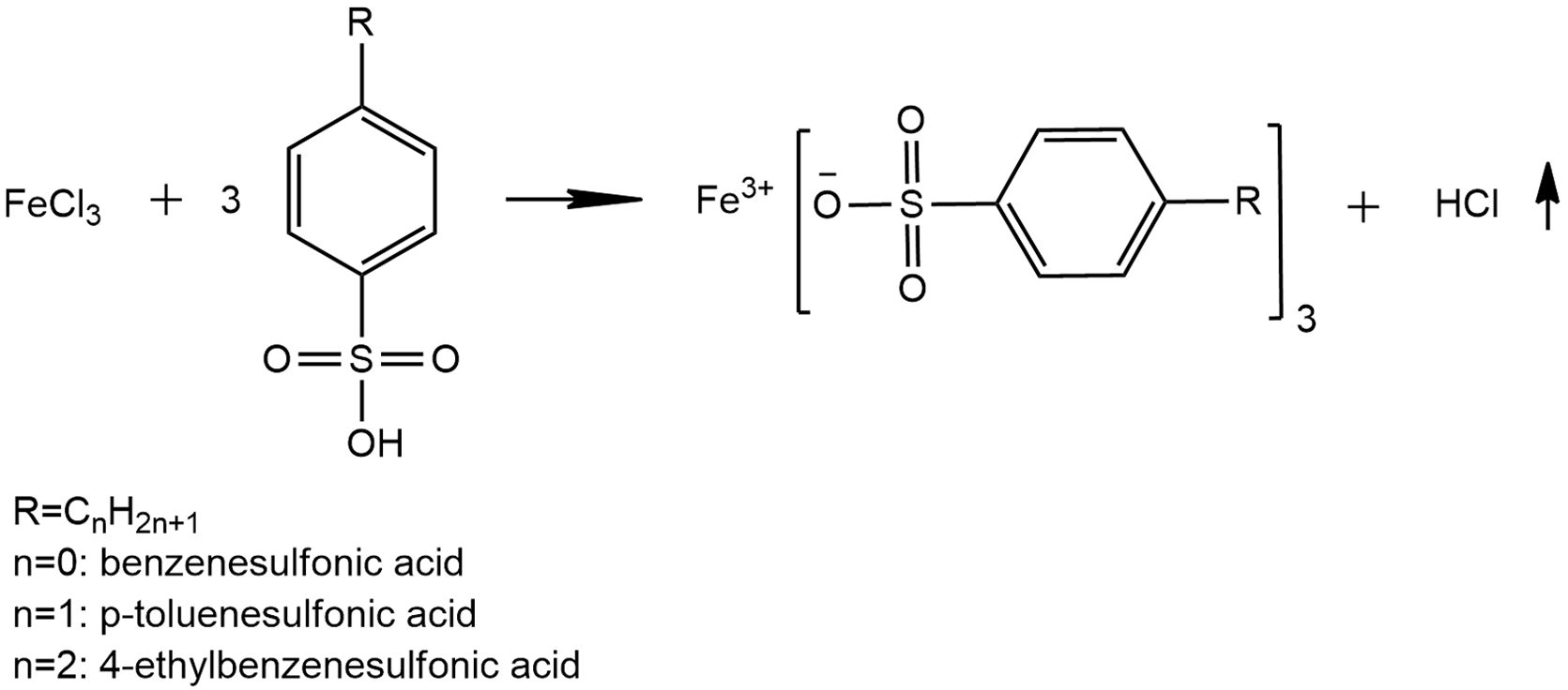 Ferric chloride hexahydrate, alkyl-benzenesulfonic acid(benzenesulfonic acid monohydrate 또는 p-toluenesulfonic acid monohydrate 또는 4-ethylbenzene-sulfonic acid monohydrate), 1-butanol을 각각 1:3:3 몰 비율로 정량하여 함께 용해시킨 후 용매가 증발할 때까지 60 oC에서 교반, 진공오븐에서 80 oC로 건조시켰다. 건조된 산화제를 막자사발을 이용해 곱게 간 후, 남아있는 용매를 제거하기 위해 80 oC에서 2차 진공 건조를 진행하였다. 제조한 산화제의 알킬기의 길이에 따라 산화제의 벤젠고리의 파라 위치에 존재하는 알킬기의 탄소숫자에 의거하여 각각 oxidant-A0, A1, A2로 명명하였다(Figure 1).