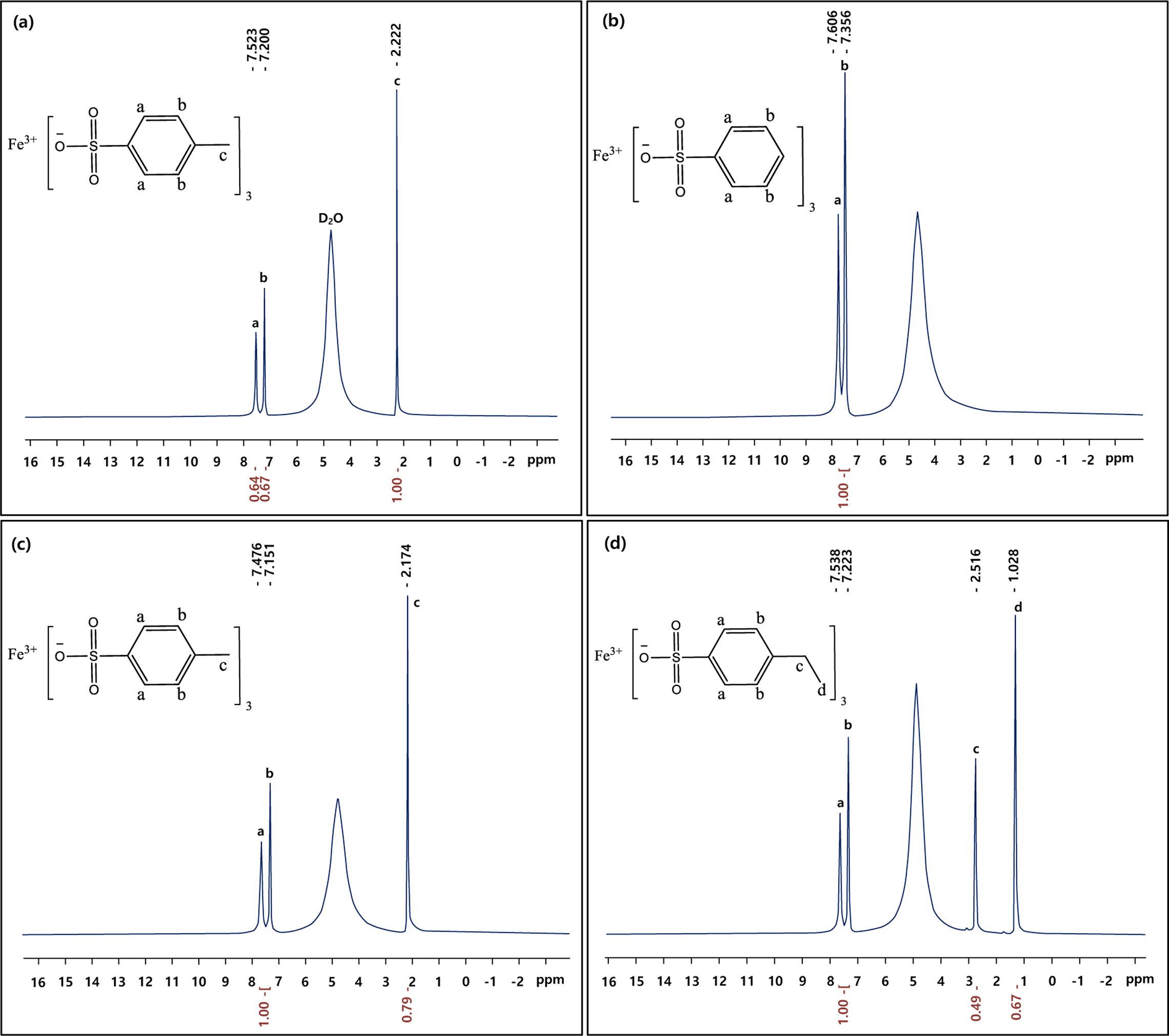 Figure 2 1 H NMR spectra of iron(III)-alkylbenzenesulfonate: (a) iron(III) p-toluenesulfonate (Aldrich); (b) iron(III) benzenesulfonate (oxidant-A0); (c) iron(III) p-toluenesulfonate (A1); (d) iron(Ⅲ) 4-ethylbenzenesulfonate (A2). |