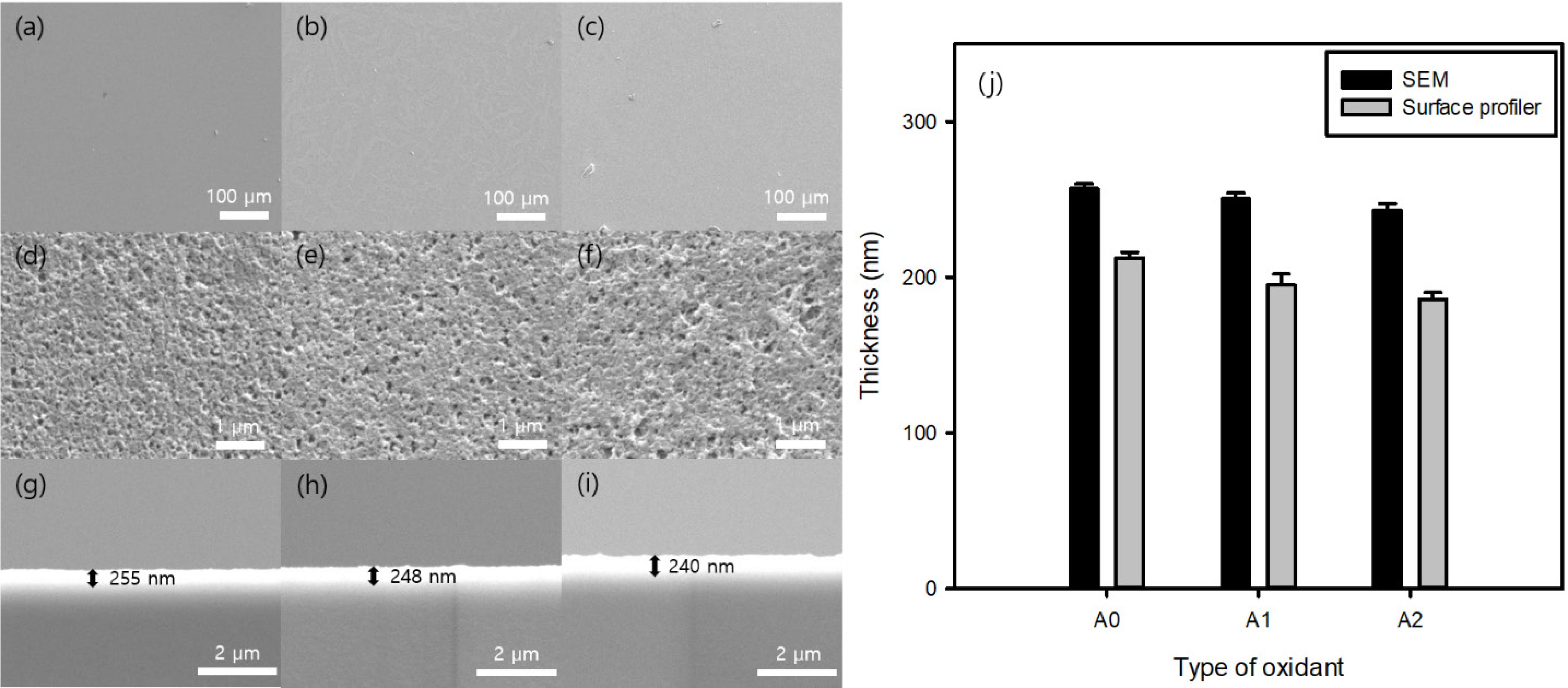 PPy 박막의 모폴로지 분석.알킬기의 길이가 다른 산화제 세 가지를 사용하여 VPP 공정을 이용해 유리 기판 위에 PPy 박막을 제조하였다. Figure 3은 FE-SEM을 이용해 PPy 박막들의 표면 모폴로지를 관찰하고 FE-SEM과 surface profiler를 이용하여 측정된 박막 단면과 두께를 비교하였다. 알킬기의 길이가 다른 산화제로 제조된 3종 박막의 PPy 박막은 평탄하였다(Figure 3(a, b, c)). 기존 문헌과 유사하게 5만배 배율의 FE-SEM 박막표면 구조는 PPy 입자들이 연결되어 성막된 구조로, 박막을 구성하는 전형적인 ICP 입자 크기를 반영하는 부분적인 pin hole 구조를 보이는 것을 관찰할 수 있었다(Figure 3(d, e, f).18,30,31 알킬기의 길이가 짧아질수록 박막 표면 모폴로지는 더욱 작고 치밀한 pin hole 구조를 보였다. Oxidant-A0, A1 및 A2로부터 제조된 PPy 박막의 전형적인 pin hole 크기의 범위는 각각 64~96, 129~194, 226~ 290 nm였다. 산화제의 알킬기 길이가 짧아질수록 제조된 PPy 입자들은 더욱더 작고 균일한 크기를 가졌을 것이라고 추정된다. 이처럼 더욱 작고 균일한 크기의 PPy 입자들이 성막될 경우, 전도입자들의 계면에 접촉면이 넓어져 전기 전도도가 상승될 것이라고 예측할 수 있다.
