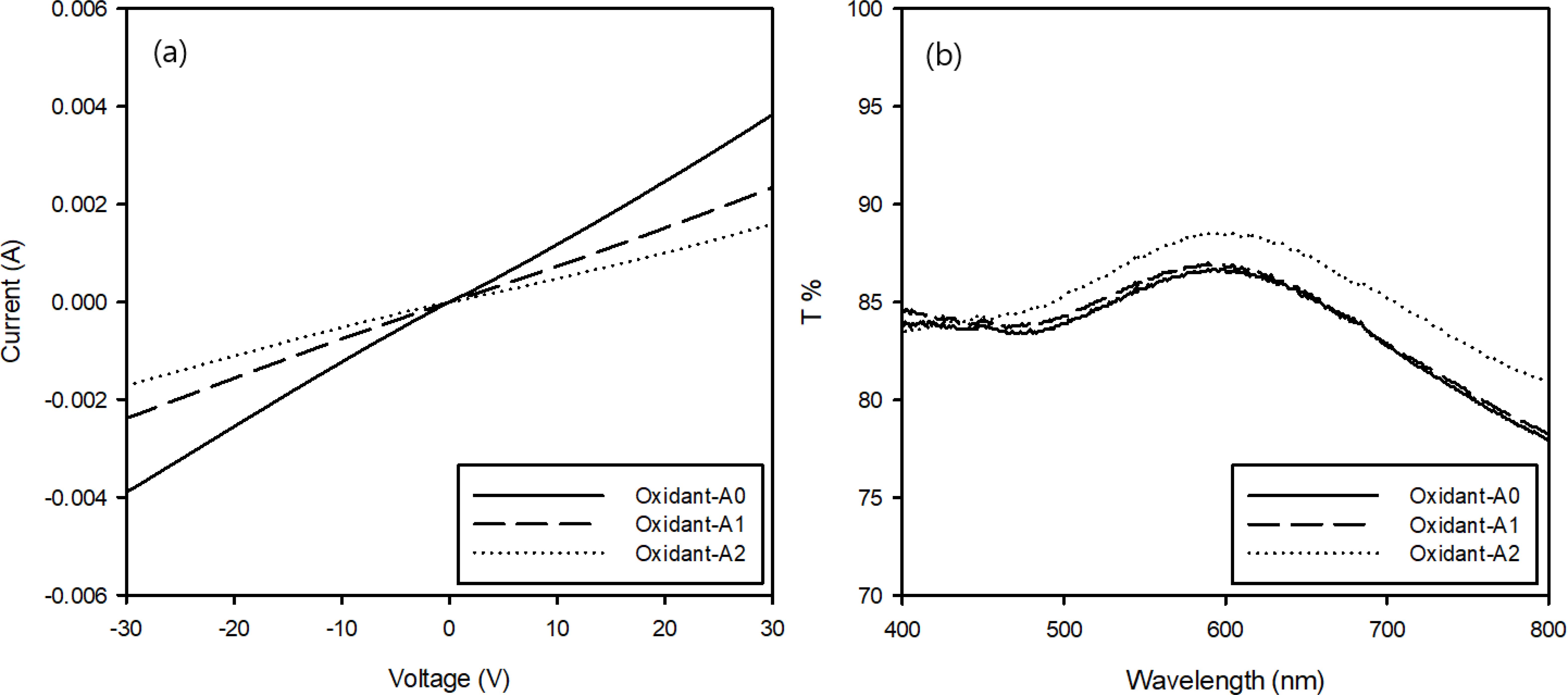 특성 분석.1H NMR(Avance III 400, Bruker, 400 MHz, D2O 용매 사용, 4.80 ppm) 분석을 통하여 합성된 산화제의 화학구조를 확인하였다. ICP 박막들의 전기적 특성분석을 위하여 표면저항과 I-V 거동을 조사하였다. 표면저항 측정을 위해 팁의 반지름이 100 μm인 4-point probe meter(CMT-SR 1000N, AIT)를 이용하였고 -30~30 V 범위에서 prove station (Agilent Technologies, E5270A, U.S.A)을 사용하여 I-V curve를 얻었다. 400~800 nm 범위에서 UV-Vis spectroscopy (Mega U600, Scinco)를 사용하여 광학적 특성을 조사하였다. Field emission scanning electron microscopy(FE-SEM, MIRA 2, TESCAN)를 이용해 10 kV 전압 하에서 다양한 배율로 관찰하여 PPy 박막 표/단면의 형태학적 특성과 두께를 측정하였다. 또한 박막의 두께 및 평탄도를 측정하기 위해 surface profiler(Veeco Dektak 150)를 이용하였다.