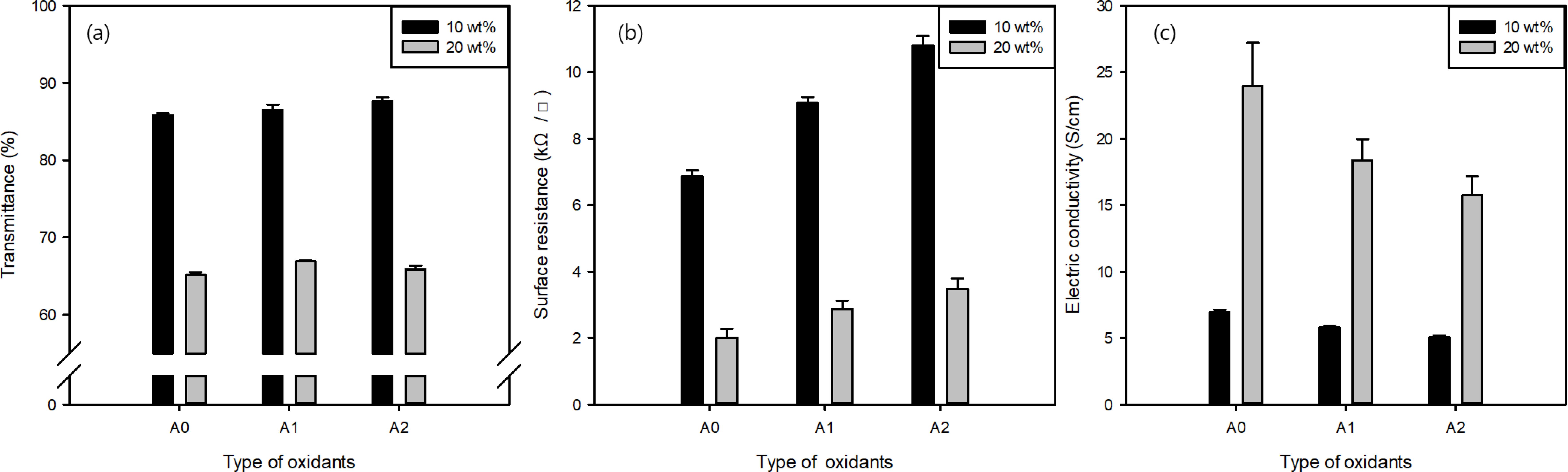 3종의 산화제의 농도를 10, 20 wt%로 바꾸어 PPy 박막을 VPP 공정으로 제조하고 광-전기적 특성을 정리하여 Figure 5에 나타내었다. 투과도는 UV-Vis 스펙트럼에서 사람의 눈에서 최대 감도를 갖는 550 nm에서의 값을 선택하여 비교하였다(Figure 5(a)). 산화제의 농도를 변화시켜도 알킬기의 길이에 따른 투과도 변화 경향은 동일하였다. 산화제의 함량이 증가할수록 투과도는 급격하게 감소하는데, 이는 PPy 박막의 두께가 증가하기 때문이다. 이것은 기존에 보고된 VPP 기반 PPy 박막의 경향과 일치하였다.34 Figure 5(b, c)는 PPy 박막의 전기적 특성을 비교하였다. 표면저항은 산화제 10, 20 wt%를 사용하더라도 산화제 알킬기의 길이에 따른 경향은 동일하였다. 즉 산화제 알킬기의 길이가 짧아질수록 표면저항은 감소하였다. 이는 벤젠고리에 대한 전자 공여성기로 작용하는 알킬기는 빠른 산화-커플링 중합반응을 일으켜 생성되는 PPy 입자의 크기를 크게 하여 성막된 박막에서의 계면 접촉면적을 떨어뜨리고 벤젠고리에 알킬기가 없는 A0 산화제의 경우 입체장애효과와 전자공여효과가 상대적으로 적기 때문에 생성되는 PPy 입자의 작아져 계면접촉면적이 커질 것으로 추정된다. Ha의 연구에서는 이러한 중합속도를 줄일 수 있는 이미다졸계 약염기(중합반응 억지제)를 첨가하여 중합속도를 줄여 생성된 PEDOT 박막의 전기 전도도가 크게 증가하였다고 보고한 바 있다.35 또한 Choi 등은 이미다졸에 다양한 전자 공여성기인 알킬기를 도입하여 생성된 박막의 전기 전도도를 향상한 바도 있다.36 Figure 5(c)의 전기 전도도는 식 (1)을 이용해 계산하였다.