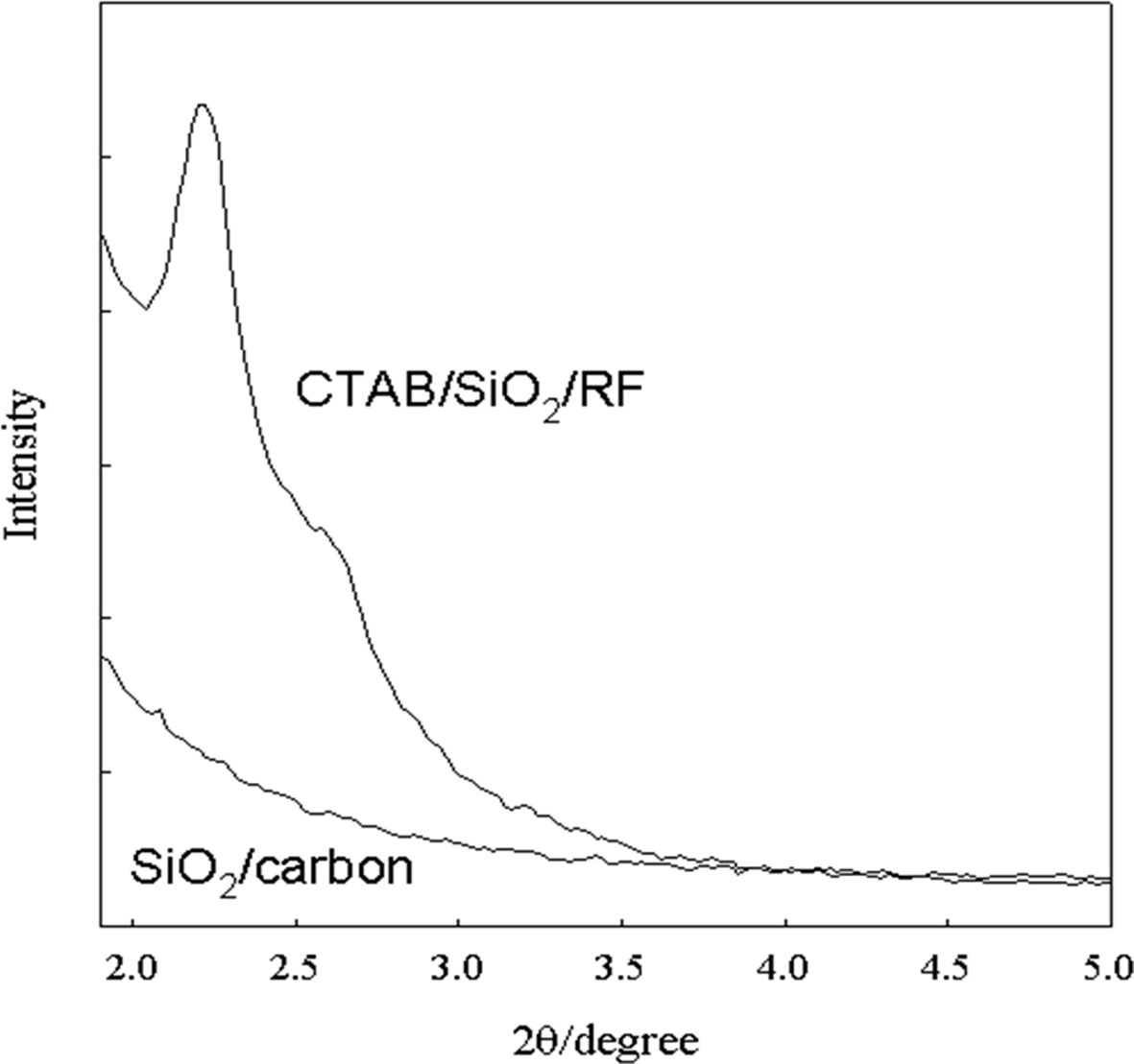 Figure 1 Small angle X-ray diffraction patterns of CTAB/SiO2/RF nanocomposite and SiO2/carbon material after carbonization process. |