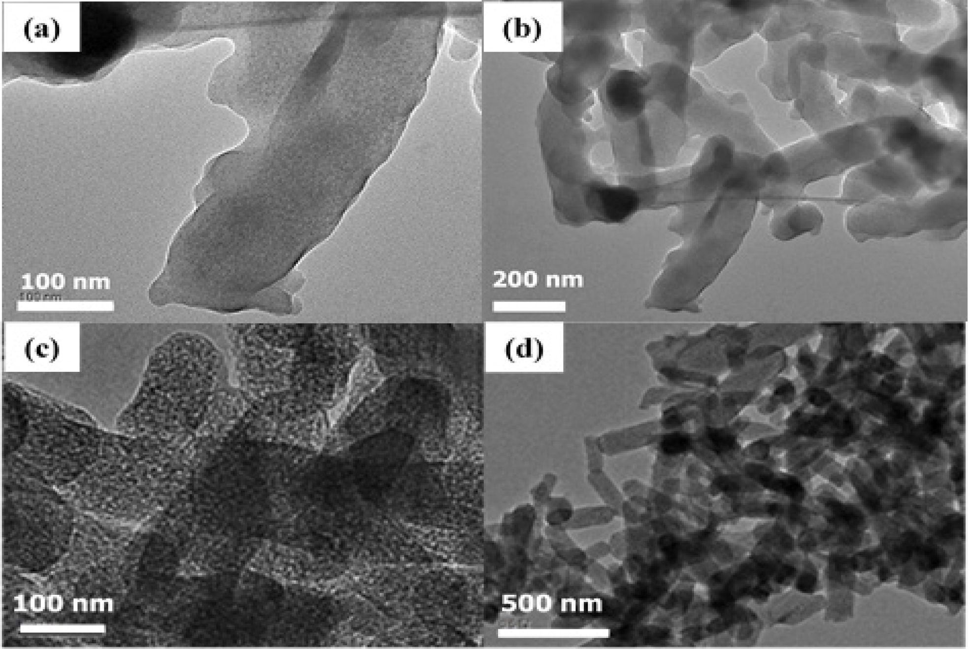 Figure 2 (a) and (b); TEM images for SiO2/carbon nanocomposite before HF etching. (c) and (d); TEM images of MPCNR. |