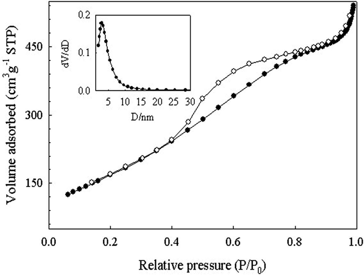 Using Micromeritics ASAP 2010 apparatus, pore size distribution (PSD) was obtained from N2 sorption measurement. The particle and pore image were measured by a transmission electron microscope (TEM, JEOL JEM-2010). X-ray diffraction experiment was conducted by Rigaku D/Max-3C diffractometer with Cu Ka radiation l = 0.15418 nm.