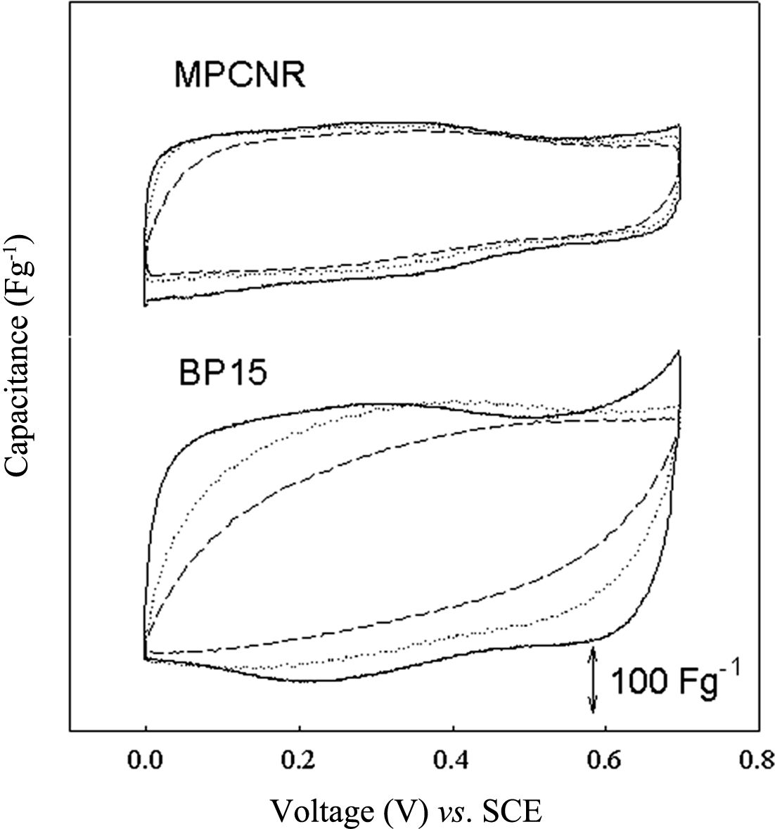 Figure 4 Capacitance vs. voltage profiles for MPCNR and BP15 electrode which was obtained by dividing specific current by scan rate. Solid, dotted and dashed line are 5, 10, 50 mV s-1 scan rate |