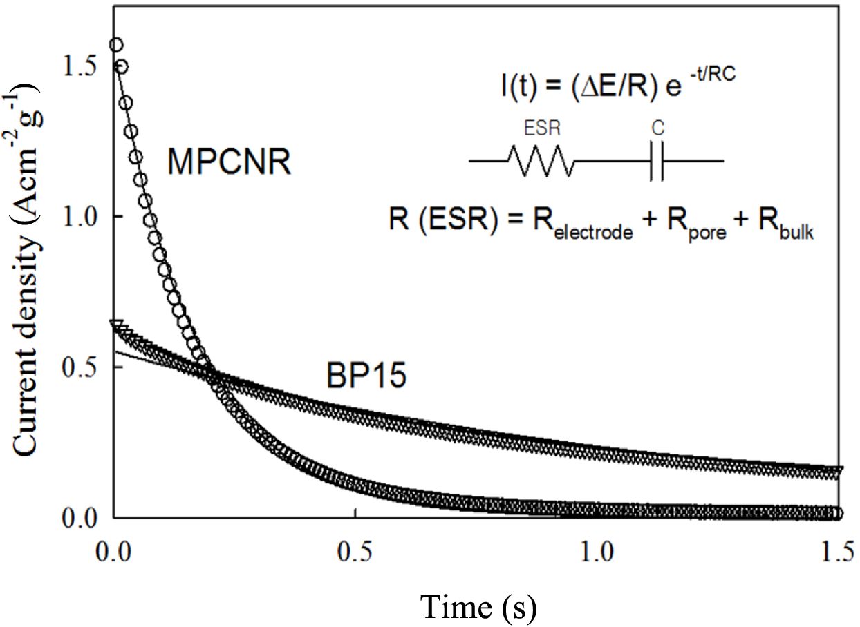 Here, Relectrode, Rpore and Rbulk correspond to electronic resistance of electrode, pore resistance and bulk ionic resistance between working and reference electrode, respectively. After adding conducting materials above 7 wt%, Relectrode was so small as about 0.2 mΩ cm2 g. Rbulk was calculated to be 3.0 mΩ cm2 g, which was estimated in our previous report. Above two values of resistance were almost constant for two carbon electrodes.2,5 Value of ESR was measured by chronoamperometry as shown in Figure 5. Here, 10 mV voltage step was applied into two EDLC electrodes at 0.5 V vs. SCE and following current density was recorded in very 10 ms. The inset equation of Figure 5 was used for the calculation of ESR. After extraction of Rbulk and Relectrode from ESR, Rpore was estimated and compared. Rpore values of two carbon electrodes were 3.4 and 15.0 mΩ cm2 g for MPCNR and BP15, respectively. For better comparison, all of calculated data was presented at Table 1. As listed, Rpore of MPCNR has much lower than that of BP15 electrode. Because MPCNR has well developed mesopores within nanorod particles, low Rpore of MPCNR is mostly due to large pores size with short pore length within nanorod.
